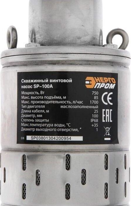 Мощность 750 Вт. Параметры сети: 220В/ 50Гц. Макс. Высота подъёма 80 м. Производительность 1700 л/час. Алюминиевый провод, тип масляной, длинна кабеля 25 м. Диаметр насоса 100 мм. Степень защиты: IP68.