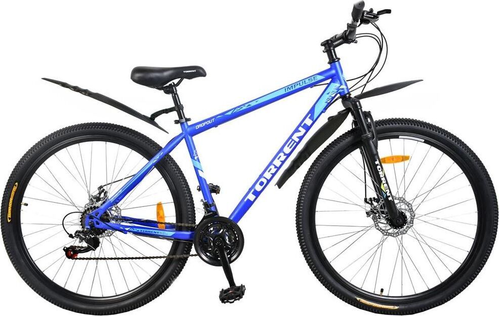 Велосипед TORRENT Impulse подходит для езды по выделенным городским велодорожкам, пересеченной местности, а также сельских и загородных прогулок. Рама классическая алюминиевая. Велосипед имеет такую конструкцию, которая позволяет перемещаться по дорогам со сложным рельефом (ямы, горки, пологие спуски). Комфортность езды достигается за счет гашения передним амортизатором толчков и вибраций, образующихся при столкновении колес с препятствием. Дисковые тормоза обеспечивают надежное торможение. Сиденье средней мягкости регулируется по высоте. Фиксация высоты сиденья происходит с помощью ручного зажима «Quick release». Велосипед оснащен светоотражателями, боковым задним упором для парковки, защитой передних звёзд и пластиковыми крыльями. Вес велосипеда 16кг. Категория: MTB Рама (материал): сталь Размер рамы: 18″ Диаметр колес: 29″ Количество скоростей: 21 Вилка передняя: амортизационная Амортизатор задний: нет Система: LYD Кассета (блок звезд): SAIGUAN