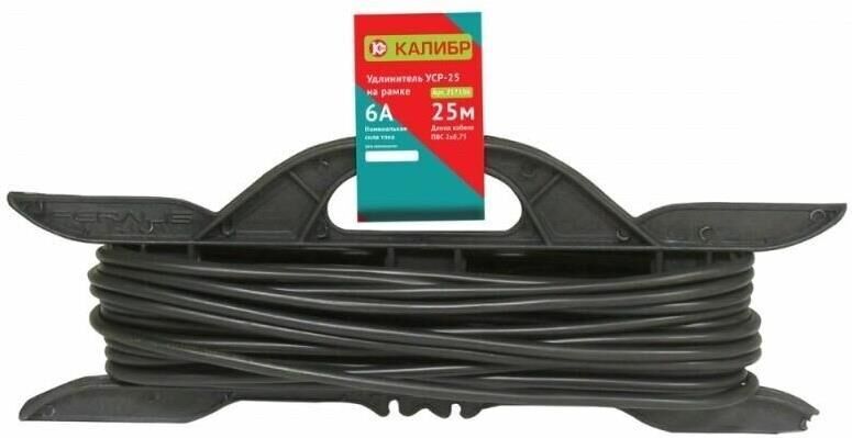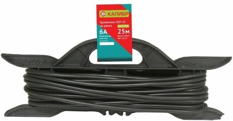 Удлинитель электрический "Калибр УСР-25" на рамке, предназначен для работы в сетях переменного тока напряжением 230±10%, ~50 Гц. При помощи удлинителя легко подключить удалённые от стационарной розетки электроприборы, имеющие шнур с плоской или круглой вилкой. Незаменим - на стройке, садовом участке, в промышленности и в быту. *в зависимости от поставки, внешний вид рамки может отличаться от представленного на фотографии. Сечение 0,75 мм2. Максимальная нагрузка 6 А, 1300 Вт. Длина кабеля 25 м.