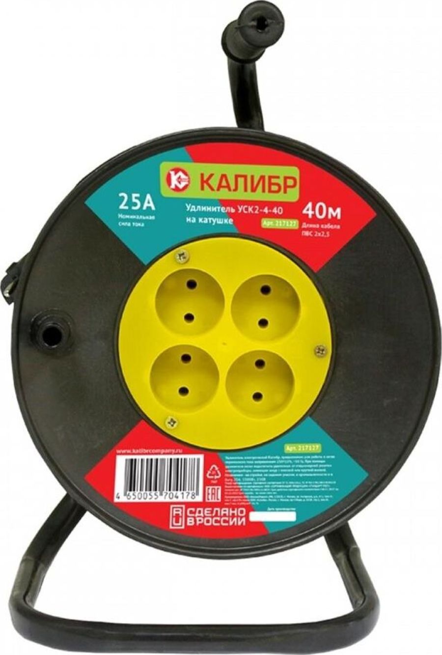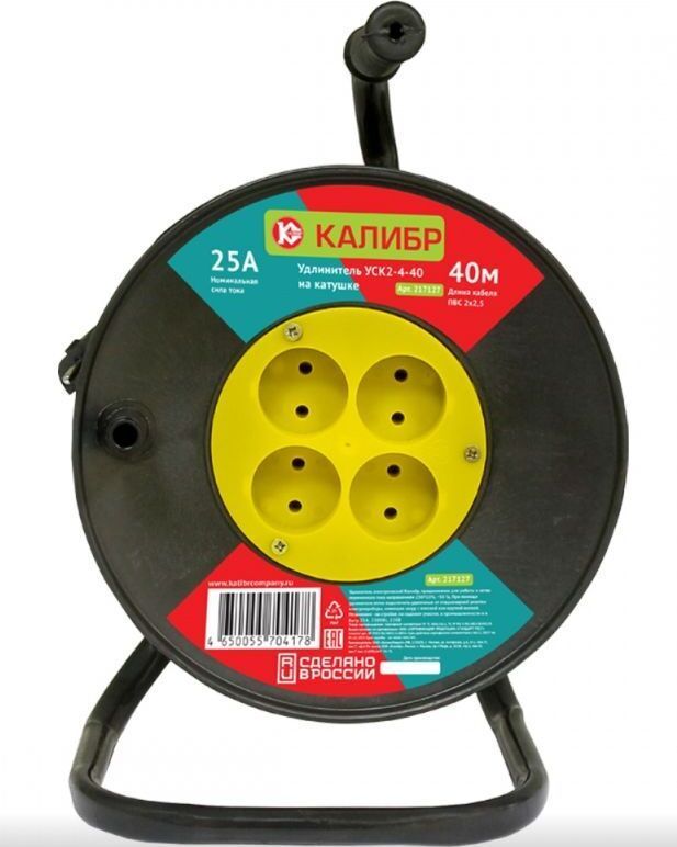 Удлинитель электрический "Калибр УСК2-4-40" на катушке предназначен для работы в сетях переменного тока напряжением 230±10%, ~50 Гц. При помощи удлинителя легко подключить удаленные от стационарной розетки электроприборы, имеющие шнур с плоской или круглой вилкой. Незаменим на стройке, на садовом участке, в промышленности и в быту. *в зависимости от поставки, внешний вид катушки может отличаться от представленного на фотографии. Сечение 2,5 мм2. Максимальная нагрузка 16 А, 3600 Вт. Длина кабеля 40 м.