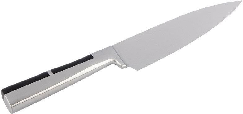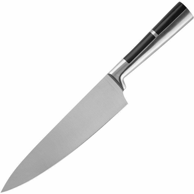 Кованый цельнометаллический нож из качественной высокоуглеродистой стали марки 3Cr13. Оригинальная эргономичная форма рукоятки Вставки из АБС пластика В отличие от недорогих штампованных ножей, лезвия у них не гнутся и держат заточку гораздо дольше других ножей. Толщина лезвия ножа - 2,5 мм. Длина лезвия: 20 см Гравировка на лезвии (логотип) Материал: нержавеющая сталь ( лезвие - 3CR13, рукоятка - 430), АБС пластмасса Ножи PROFI с кованой рукояткой из нержавеющей стали и вставками из АБС-пластика отличаются удобством использования и долговечностью. Прочная и удобная эргономичная рукоятка не скользит в ладони при использовании и не впитывает запахи. Cталь отличается высокой износостойкостью и обладает прочной режущей кромкой. Ножи успешно справляются с нарезкой колбас и сыров, измельчением фруктов и овощей, разделкой мяса и рыбы.