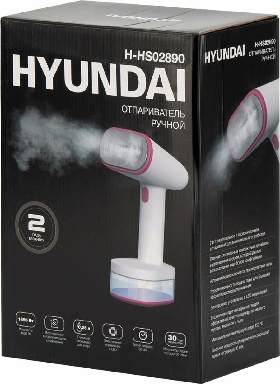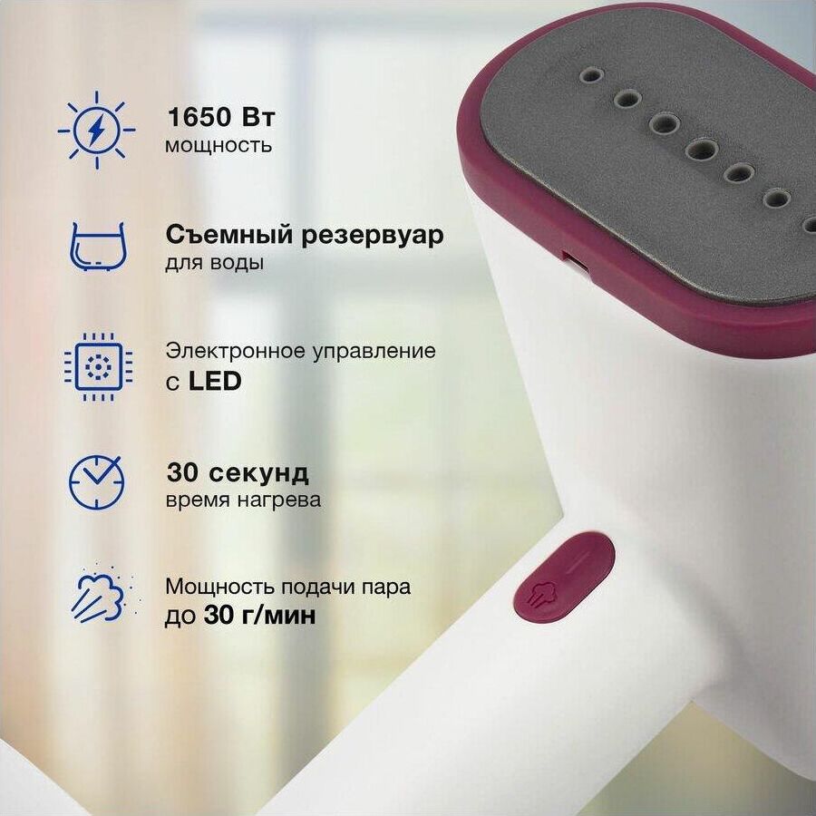 Мощность: 1650 Вт Мощность подачи пара до 30 г/мин Съемный резервуар для воды объемом 0.25 л Электронное управление с LED индикацией 2 уровня мощности подачи пара Время нагрева до 30 сек Керамическое покрытие подошвы Горизонтальное и вертикальное отпаривание (2 в 1) Максимальная температура пара 150 °C Индикация включения Индикация готовности к работе Индикация уровня воды Функция самоочистки Функция автоотключения Комплектация: Насадка-щетка 1 шт., мерная емкость Длина сетевого шнура 1.9 м