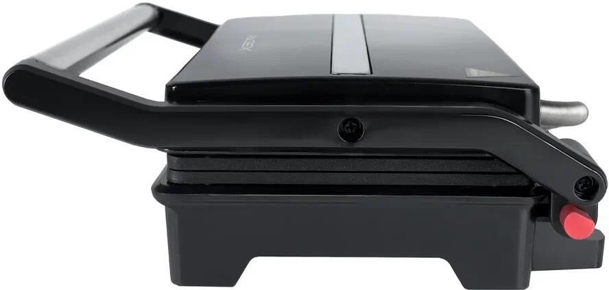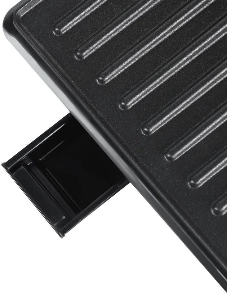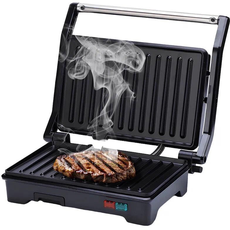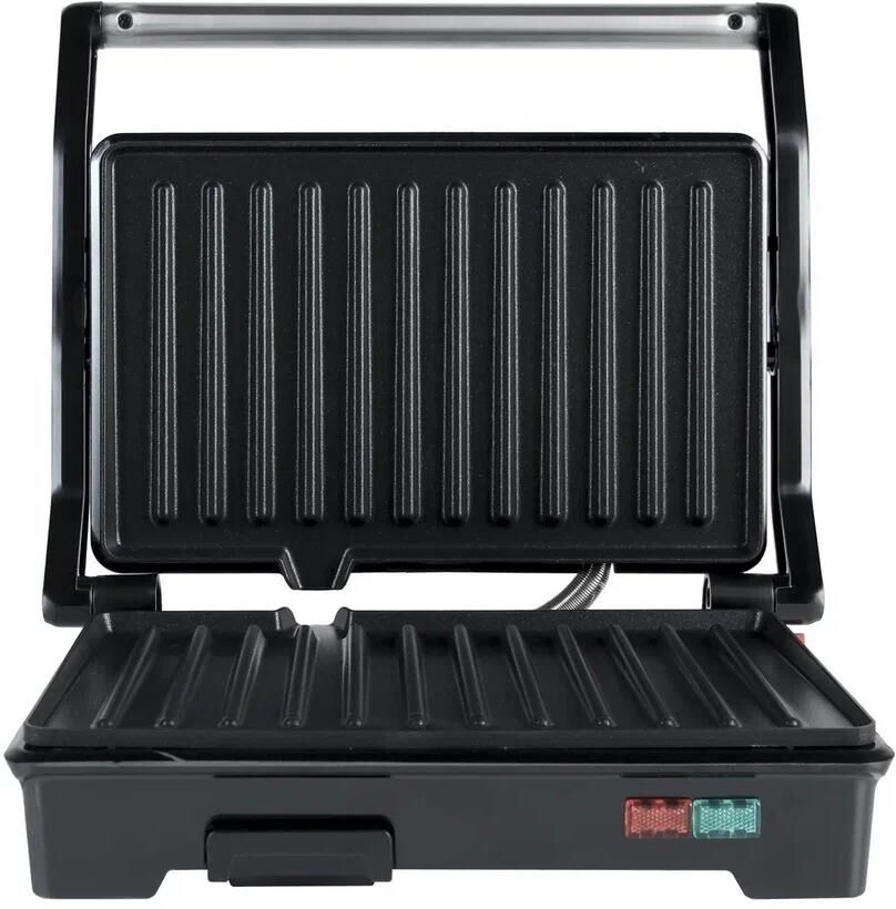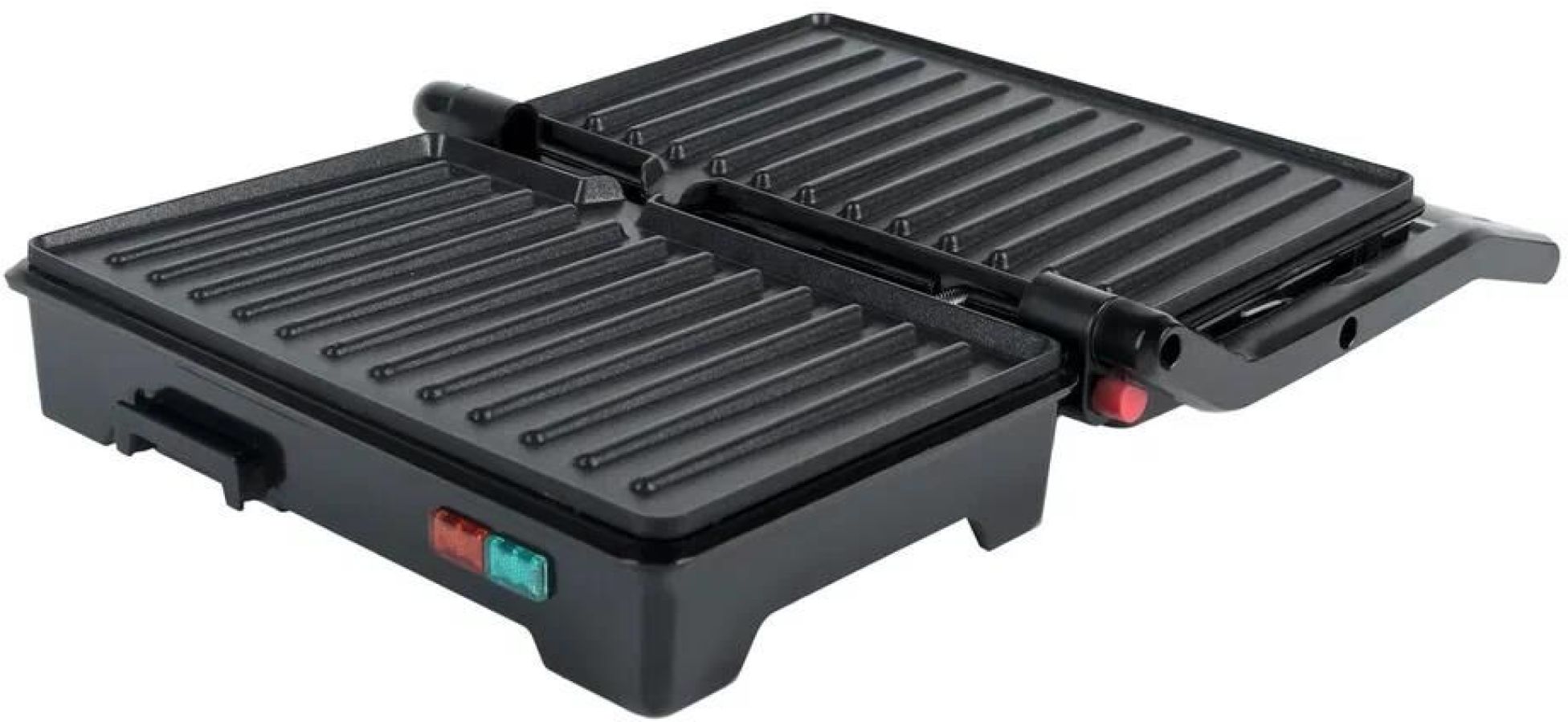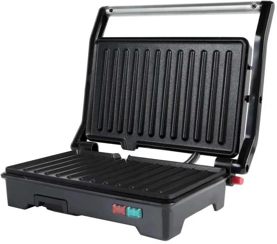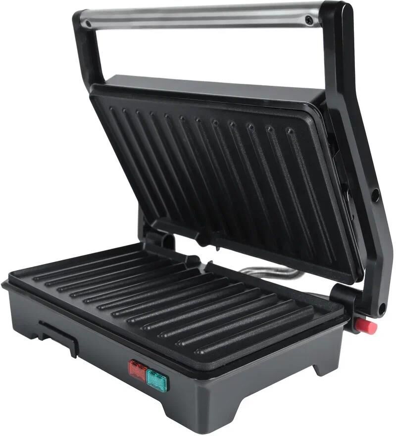 Современный электрогриль мощностью 750 Вт идеально подходит для приготовления разнообразных блюд - от сочного мяса и птицы до полезных овощей и аппетитных бургеров. Устройство с черным пластиковым корпусом и крышкой из нержавеющей стали оснащено тефлоновой рабочей поверхностью с антипригарным покрытием, обеспечивающей легкое приготовление без пригорания и простую очистку. Прижимная конструкция гарантирует равномерное прожаривание продуктов с обеих сторон, а удобное открытие на 180 градусов делает процесс приготовления максимально комфортным. Практичные особенности включают: предварительный нагрев, не нагревающуюся ручку для безопасного использования, антискользящие ножки для устойчивости, поддон для сбора жира, а также индикаторы питания и готовности для контроля работы. Кабель длиной 80 см обеспечивает удобное размещение на кухне.