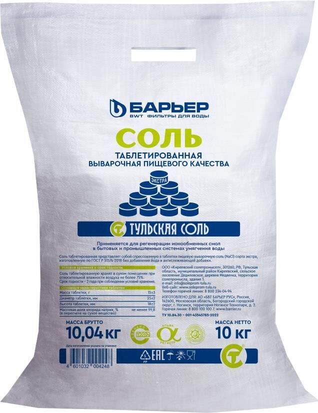 Соль таблетированная БАРЬЕР применятся в процессе подготовки солевого раствора в солевых баках в системах умягчения воды, а также в системах отопления и бытовых водонагревательных приборах, в целях защиты нагревательных элементов от известковых отложений. В любых системах, требующих регенерации ионнообменной смолы раствором пищевой соли. Содержание хлорида натрия 99,8%. Соль таблетированная БАРЬЕР изготавливается по ТУ10.84.30-001-43545785-2022 и представляет собой спрессованную пищевую выварочную соль (NaCl) сорта Экстра, соответствующую требованиям ГОСТ Р 51574-2018 без добавления йода и антислеживающей добавки. • Таблетированную соль упаковывают в полипропиленовые мешки массой нетто 10 кг • Срок хранения таблетированной соли — 2 года • Размер таблетки: диаметр 25 ±2 мм, высота 18±2 мм; • Масса таблетки 15±3 г Условия хранения: соль хранят в сухом помещении при относительной влажности воздуха не более 75%. После вскрытия мешка допускается хранение в плотно закрытых контейнерах.