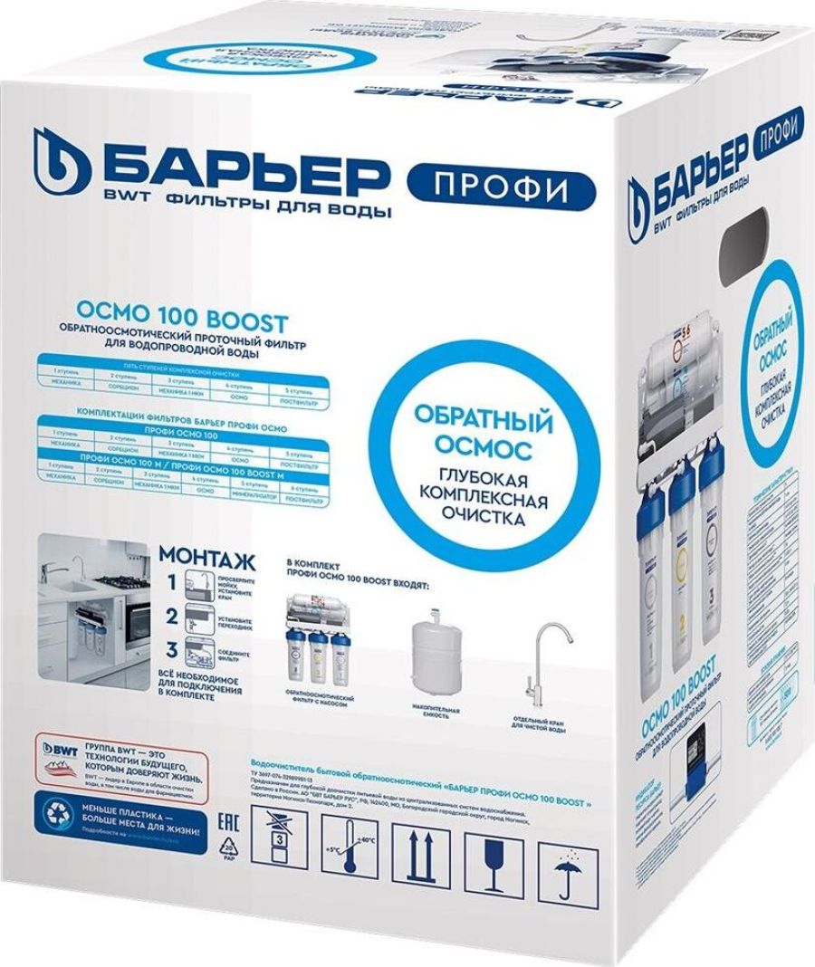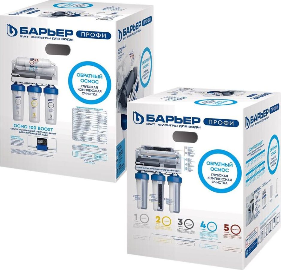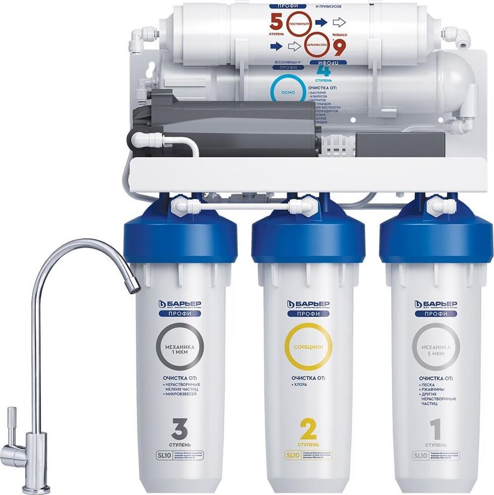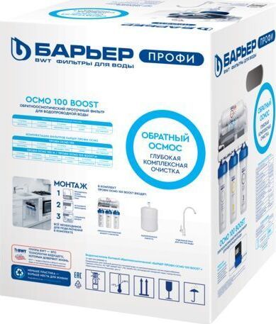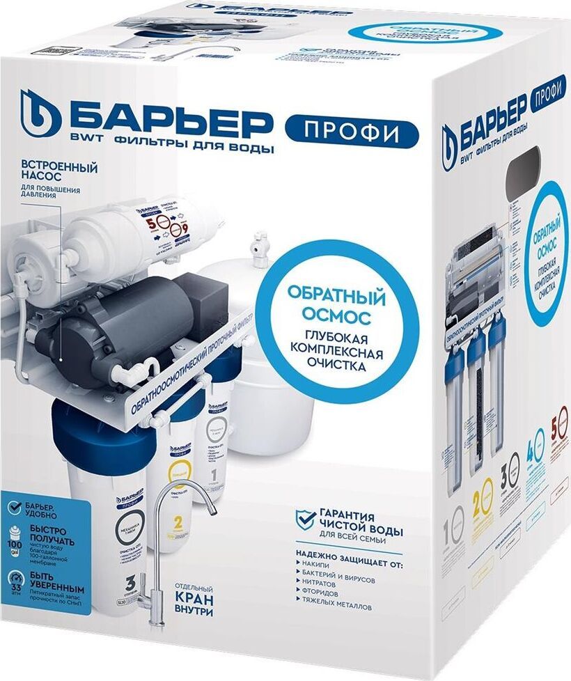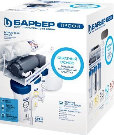 Система для очистки воды методом обратного осмоса с насосом повышения давления. Позволяет обеспечить семью кристально-чистой и водой, не уступающей по качеству бутилированной. Тип очистки воды обратноосмотическая система Объем 8 л. Ресурс 5000 л. Скорость фильтрации 0.34 л/мин. Количество картриджей в комплекте 5 шт. Система очистки пятиступенчатая. Рабочее давление до 7 атмосфер.