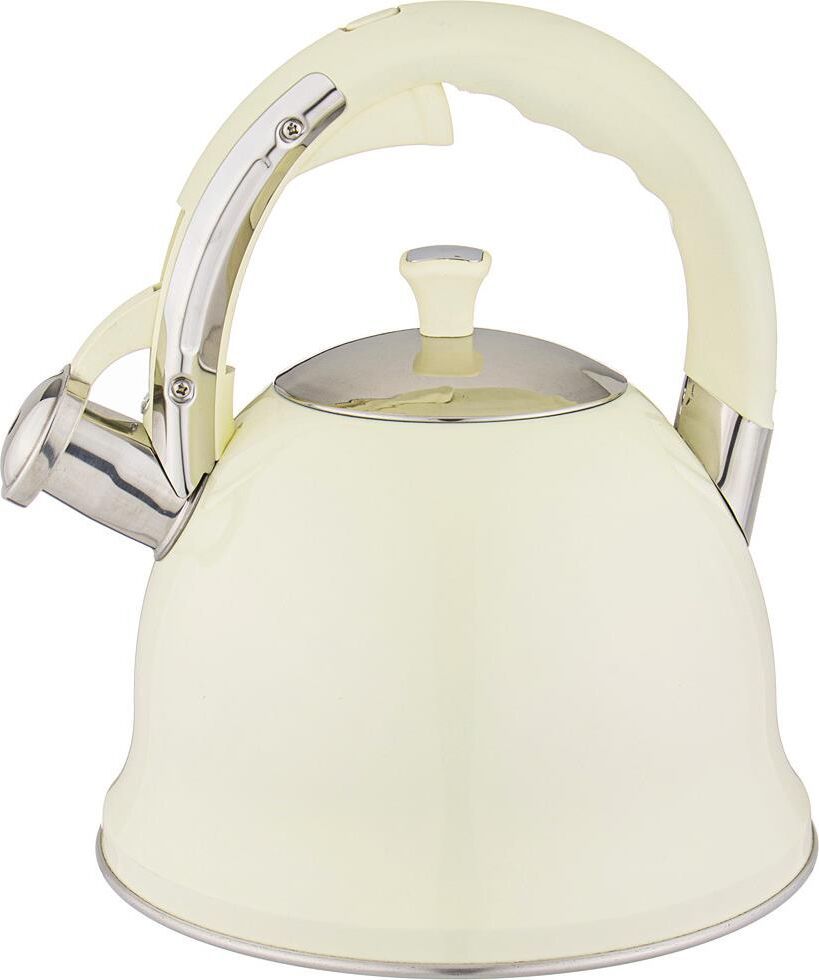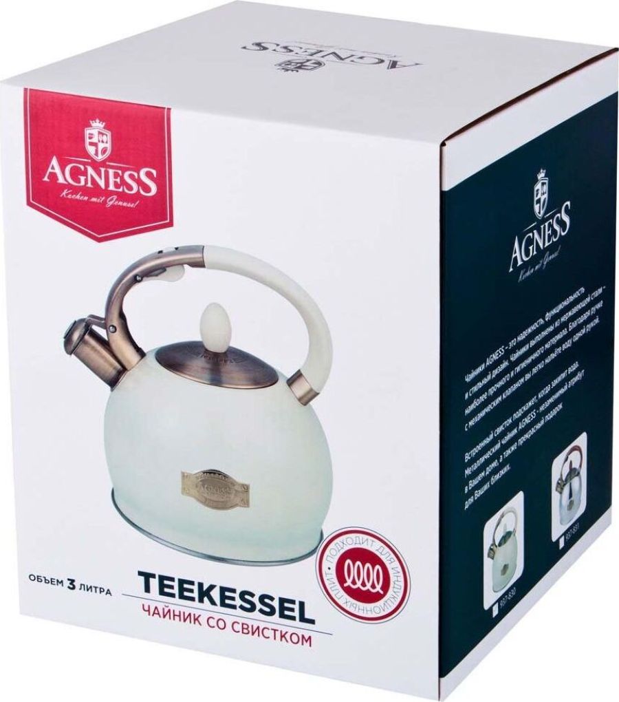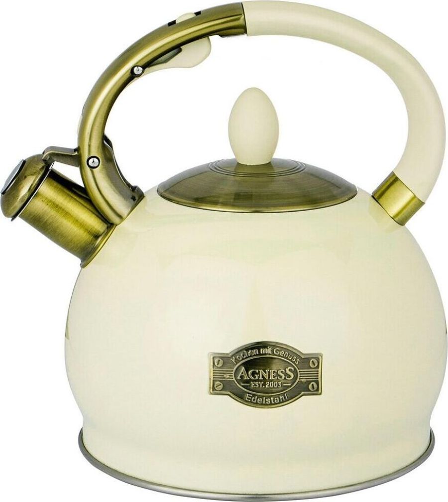 Чайник AGNESS - это надежность, функциональность и стильный дизайн. Чайник выполнен из нержавеющей стали - наиболее прочного и гигиеничного материала. Преимущества: • Капсульное термоаккумулирующее дно с прослойкой из алюминия позволяет воде в чайнике дольше оставаться горячей. В чайниках с термоаккумулирующим дном вода закипает быстрее, и дольше остается горячей. • Удобная не нагревающаяся ручка • Легко наливать воду. Используя клапан на ручке чайника, вы легко сможете налить воду. Просто нажмите на клапан, чтобы открыть носик чайника. • Встроенный свисток подскажет, что вода в чайнике закипела и его пора снимать с плиты. • Благодаря внешнее жаропрочному покрытию и стильному дизайну чайник AGNESS украсит любую кухню • Подходит для всех типов плит, включая Индукционные