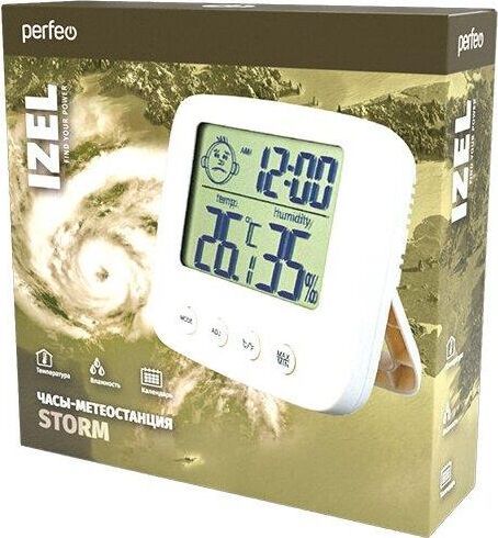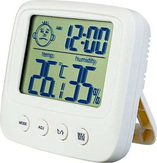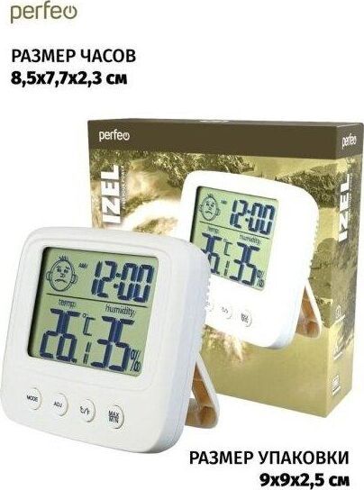 ОСНОВНЫЕ ХАРАКТЕРИСТИКИ:; • Цифровой дисплей с одновременным; отображением времени, температуры; и влажности внутри помещения; • Отображение времени: час, минута,; 12/24 часа переключаемый; • Функция будильника; • Отображение температуры: С/F; • Отображение max и