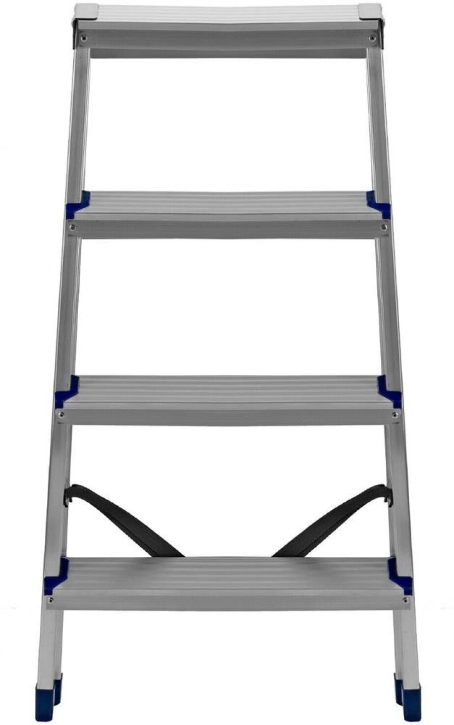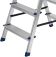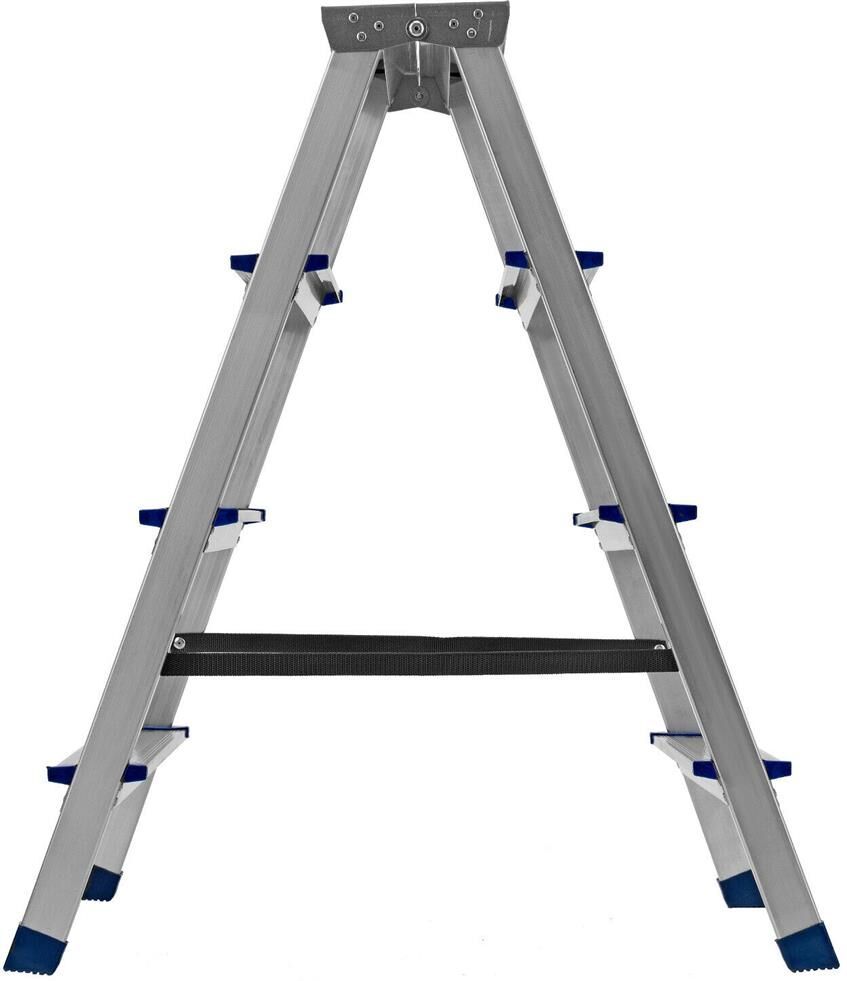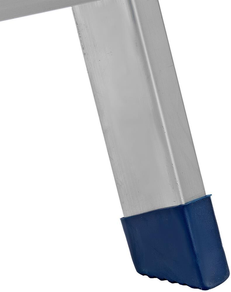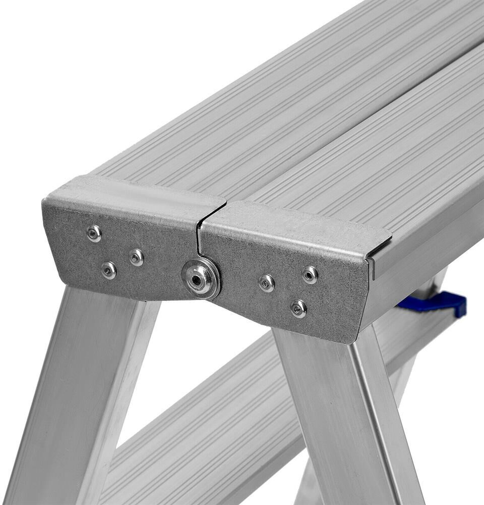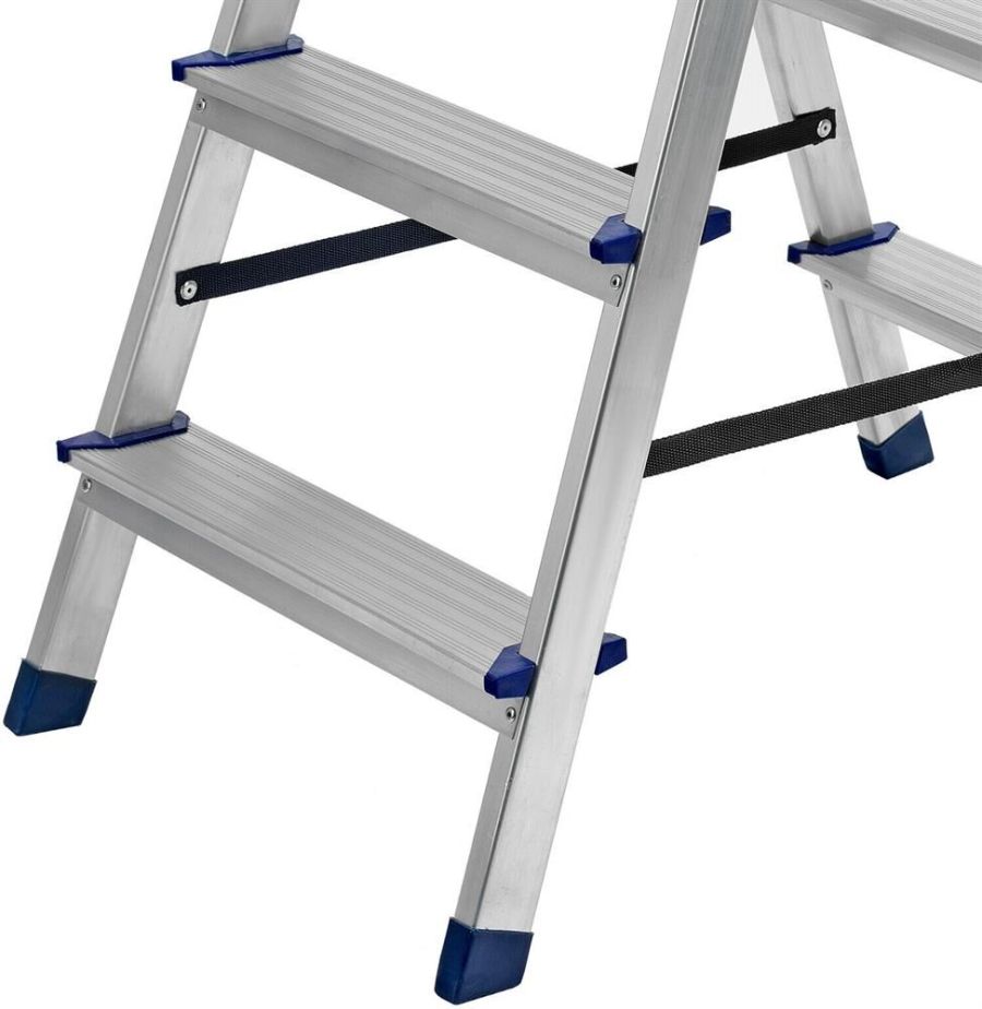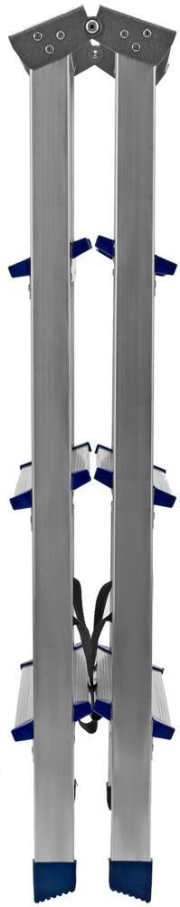 Стремянку следует устанавливать на ровную плоскость. Работа с электроинструментом не допускается. Преимущества Долговечность — стремянка выполнена из легкого, но прочного алюминия, устойчивого к коррозии.Устойчивость к высоким нагрузкам — рама из прессованного алюминиевого профиля выдерживает до 150 кг.Продуманная конструкция — нейлоновые страховочные стяжки повышают надежность фиксации стремянки в рабочем положении.Комфорт и безопасность — широкие ступени удобны для длительной работы, а пластиковые накладки на них защищают пользователя от травм.Антискользящие свойства — ступени имеют рифленую поверхность.Защита напольного покрытия — опоры с плас