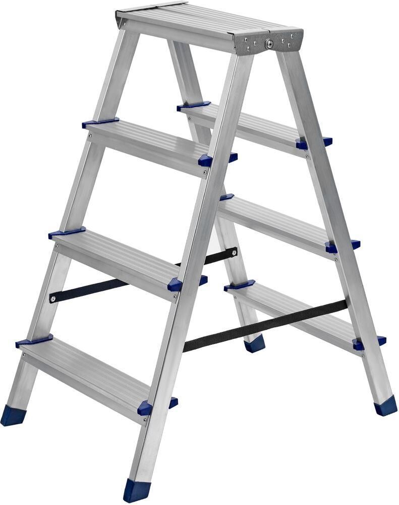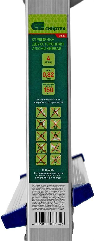Стремянка двусторонняя алюминиевая Сибртех 97924 с 4 ступенями позволяет выполнять различные действия на высоте — штукатурить или красить стены, менять лампочки, вытирать пыль, доставать нужные предметы с верхних полок. Площадка находится на высоте 82,8 см от опорной поверхности, рабочая высота стремянки составляет 282,8 см (при среднем росте пользователя 170 см).
