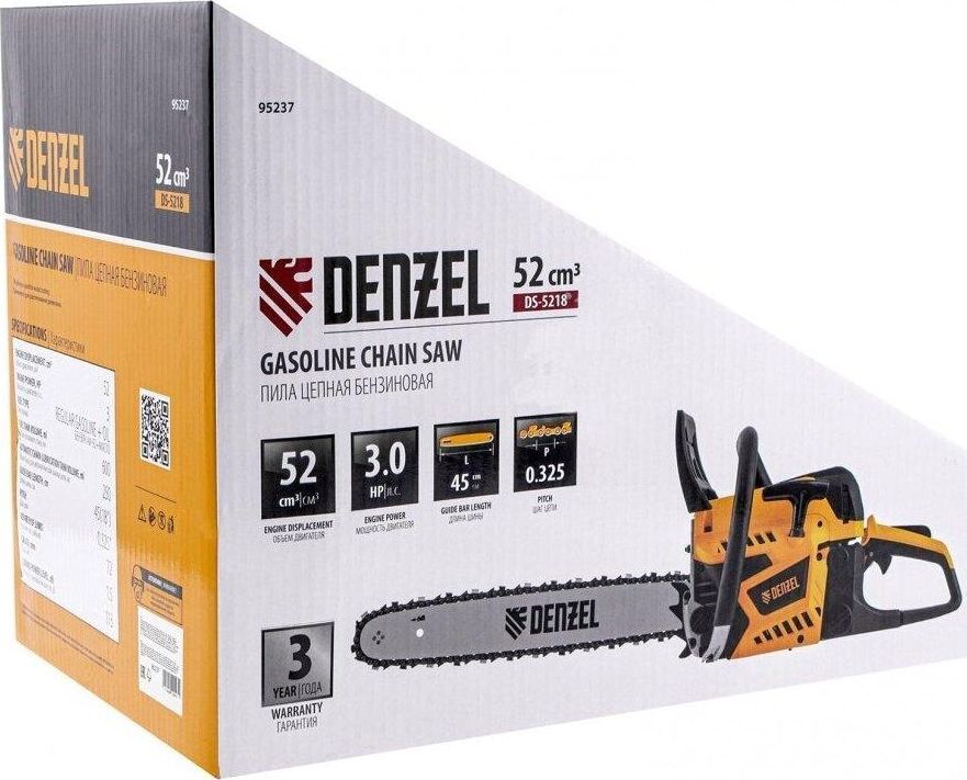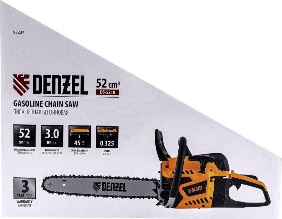 Тип двигателя бензиновый 2-тактный. Мощность 3 л. с. Класс пилы бытовая. Количество звеньев 72 шт. Объем масляного бака 250 мл. Объем топливного бака 600 мл. Уровень шума 113 дБ. Объем двигателя 52. Длина шины 450 мм Шаг цепи 0.325 дюйма. Толщина ведущего звена цепи 1.5 мм. Число оборотов холостого хода 3000 об/мин.