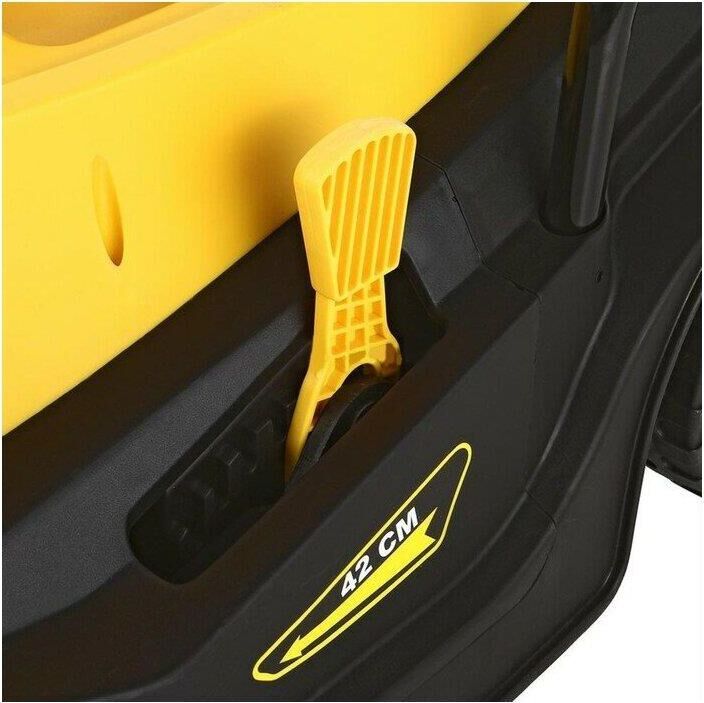 Материал травосборника пластик. Комплектация Газонокосилка. Сборная рукоятка (в комплекте с фурнитурой). Травосборник. Паспорт (инструкция). Упаковка. Напряжение сети, В 220 - 230. Частота, Гц 50. Скорость, об/мин 3200. Мощность, Вт 1800. Вес брутто, кг 13.5. Ширина среза, мм 420. Объем травосборника, л 45. Регулировка высоты среза, мм 20 — 70. Вес, кг 14.3 кг.
