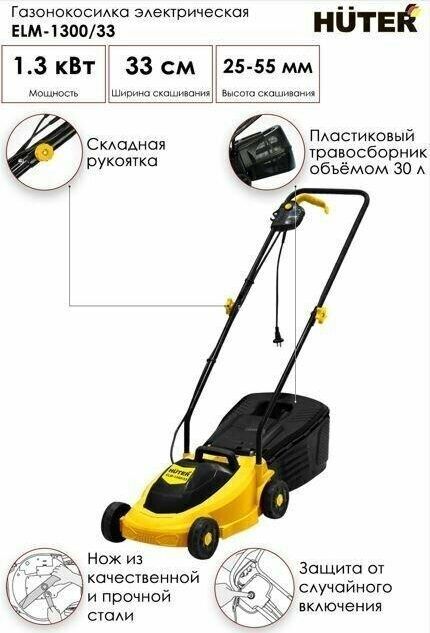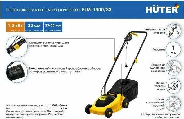 Материал травосборника пластик. Частота, Гц 50. Напряжение сети, В 220-230. Регулировка высоты среза Индивидуальная. Мощность, Вт 1300. Скорость, об/мин 3500. Ширина среза, мм 330. Объем травосборника, л 30. Регулировка высоты среза, мм 25 — 55. Вес, кг 8.5 кг.