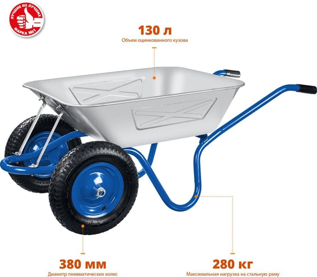 Max нагрузка, кг: 280. Внутренний диаметр подшипника, мм: 20. Диаметр рамы, мм: 32. Подшипник: стальной. Подшипник в колесе: есть. Толщина кузова, мм: 0.9. Объем корыта, л: 130. Материал кузова: цинкованная сталь. Количество колес, шт: 2. Диаметр колес, мм: 380. Вес, кг: 11.