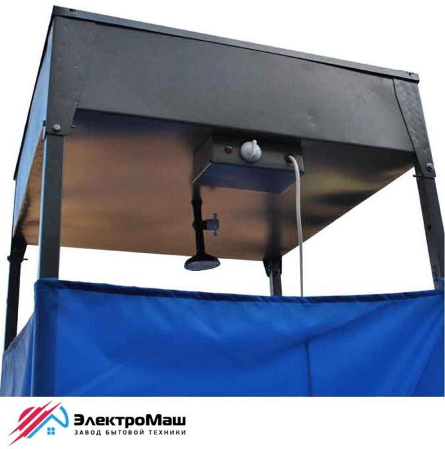 Бак - оцинкованная сталь, каркас - профильная труба 30/30 мм, Мощность нагрева - 1.25 кВт, Время нагрева до 60 град. - 50 мин., Номинальное напряжение - 220 В, деревянный поддон, штора из водоотталкивающей ткани " Оксфорд" Размер каркаса 800х800х2500, бака 800х800х200, толщина 1 мм, объем 128 л. В комплект входит: бак для воды (с нагревателем) – 1 шт.,подставка для ног (деревянная)- 1 шт., лейка для душа – 1 шт., каркас – 1 шт., шторка – 1 шт., инструкция по сборке душа – 1 шт.