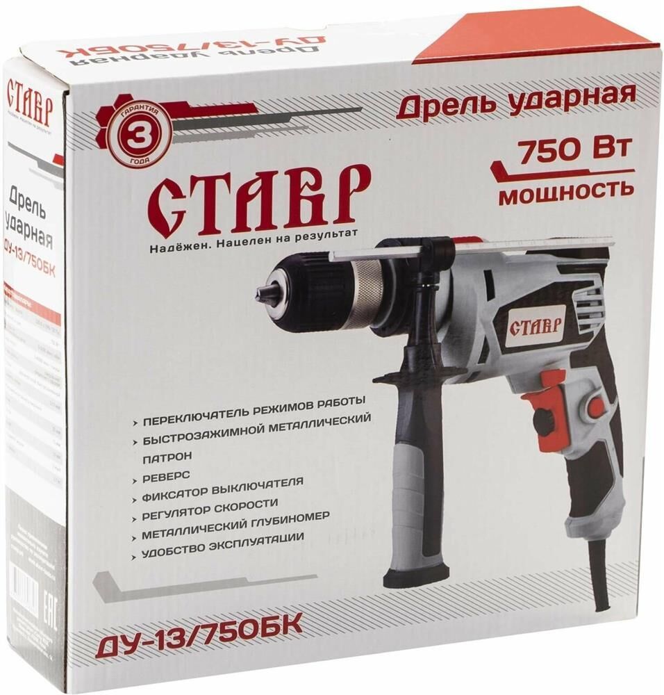 Ставр ДУ-13/750БК (10шт) Дрель ударная 750 Вт, 0-3000 об/мин, 0-40000 уд/мин, патрон 2-13мм двухмуфтовый, быстрозажимной, реверс, регулировка оборотов, шнур питания 3м