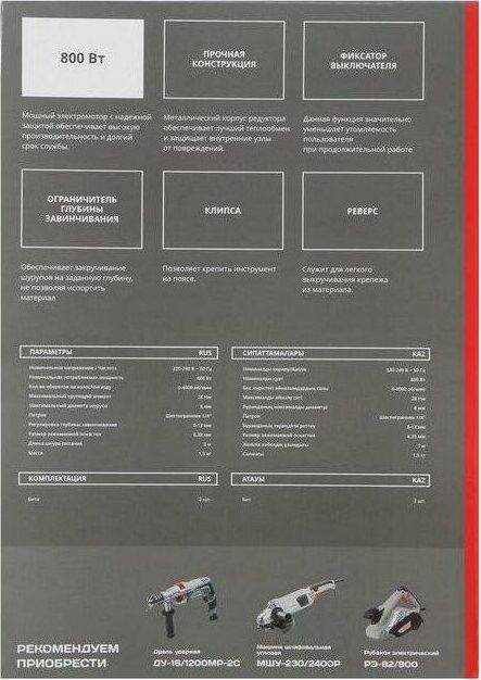 Потребляемая мощность, Вт 800. Напряжение сети / Частота, В/Гц 220В±10% / 50Гц. Число оборотов на холостом ходу, об/мин 0-4000. Максимальный крутящий момент, Нм 28. Регулировка глубины завинчивания 0-13 мм. Максимальный диаметр самореза, мм 8. Диаметр зажима, мм 6,35. Длина сетевого кабеля, м 3. Гарантийный срок 3 года. Габаритные размеры, мм 300х190х72. Масса, кг 1,5. Комплект поставки бита 2 шт.