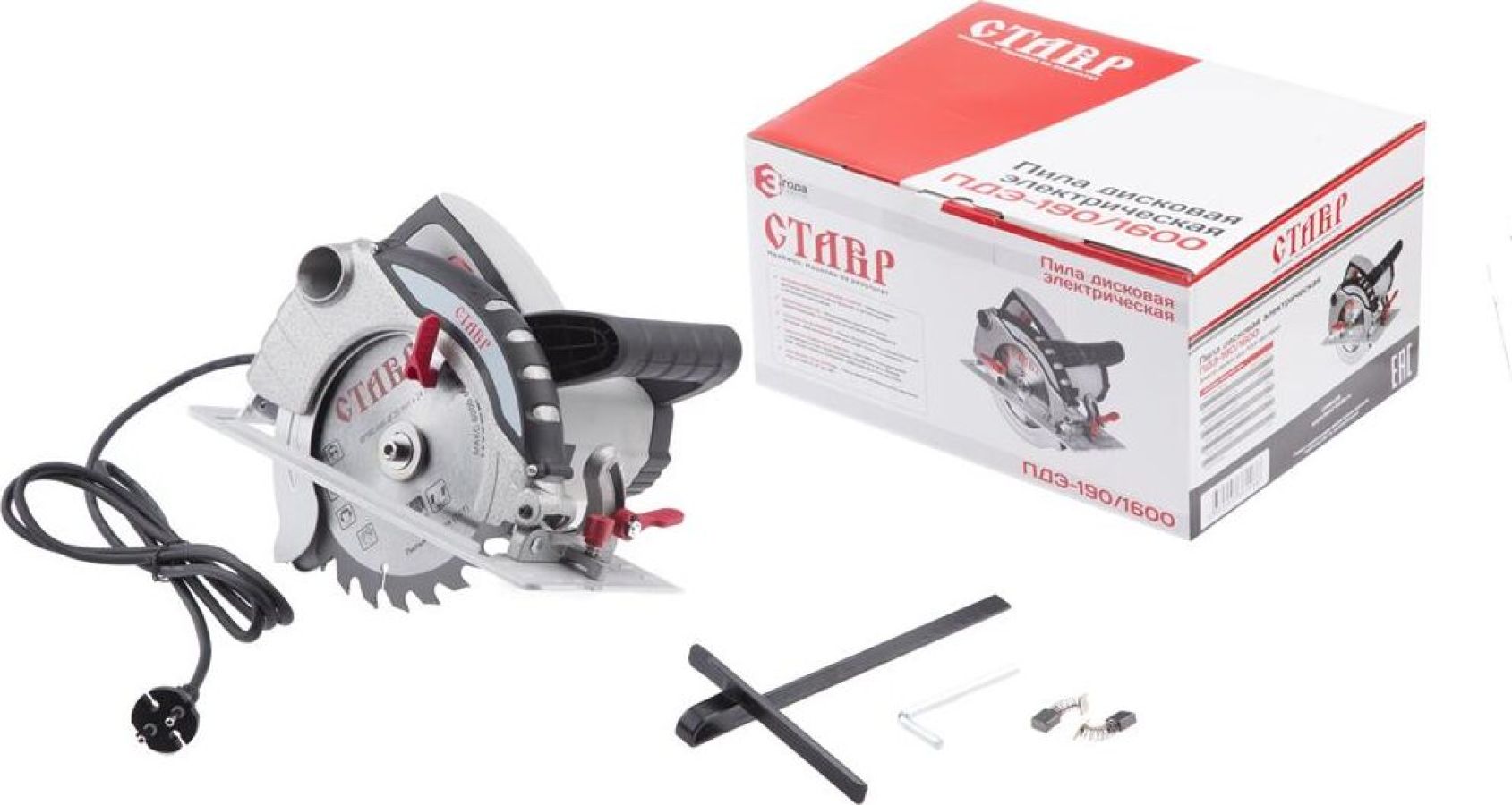 Комплект поставки: ключ, пильный диск, параллельный упор , Модификация (код производителя): ст190-1600пдэ , Функции и возможности: блокировка шпинделя, подключение пылесоса