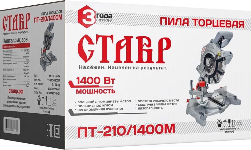 Напряжение сети, В: 220±10% Частота, Гц: 50 Потребляемая мощность, Вт: 1400 Число оборотов на холостом ходу, об/мин: 5000 Диаметр диска, мм: 210 Посадочный диаметр диска, мм: 25,4 Максимальный размер пропила, мм: 55х120 Угол распила, °: до 45 в обе стороны Максимальная глубина пропила (90°), мм: 55 Максимальная глубина пропила (45°), мм: 32 Максимальная ширина пропила (90°), мм: 120 Максимальная ширина пропила (45°), мм: 80 Длина сетевого кабеля, м: 3 Масса, кг: 6,5 Комплектация: пильный диск, зажим, шестигранный ключ, угольные щетки (запасной комплект), мешок для сбора опилок