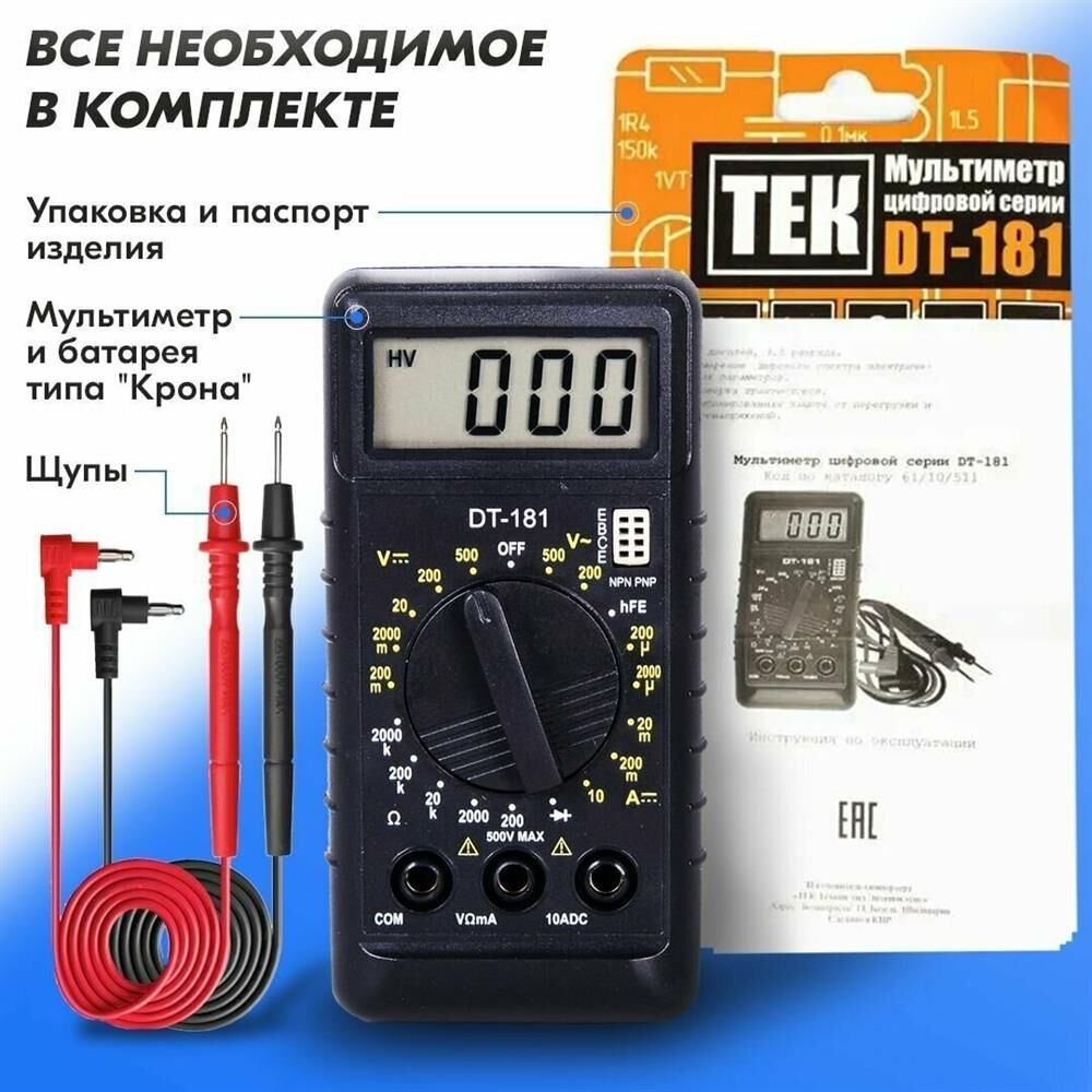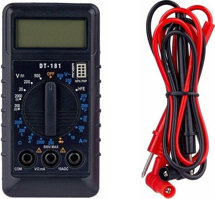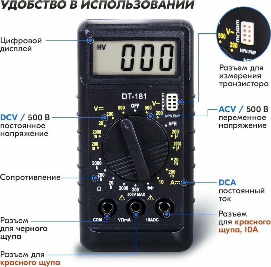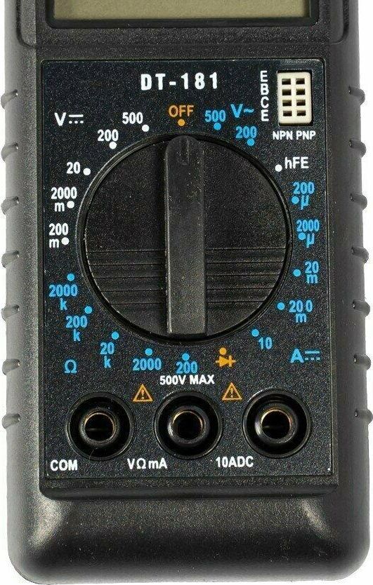 Постоянное напряжение, В 200 м-2-20-200-1000. Переменное напряжение, В 200-750. Постоянный ток, А 200-2000 мк-20 м-200 мк-10. Диод-тест 3 В/0,8 мВ. Сопротивление 200-2000-20 к- 2500 к-2000 кОм. Усиление транзистора, hFE 0-1000. Гарантия, мес. 6.