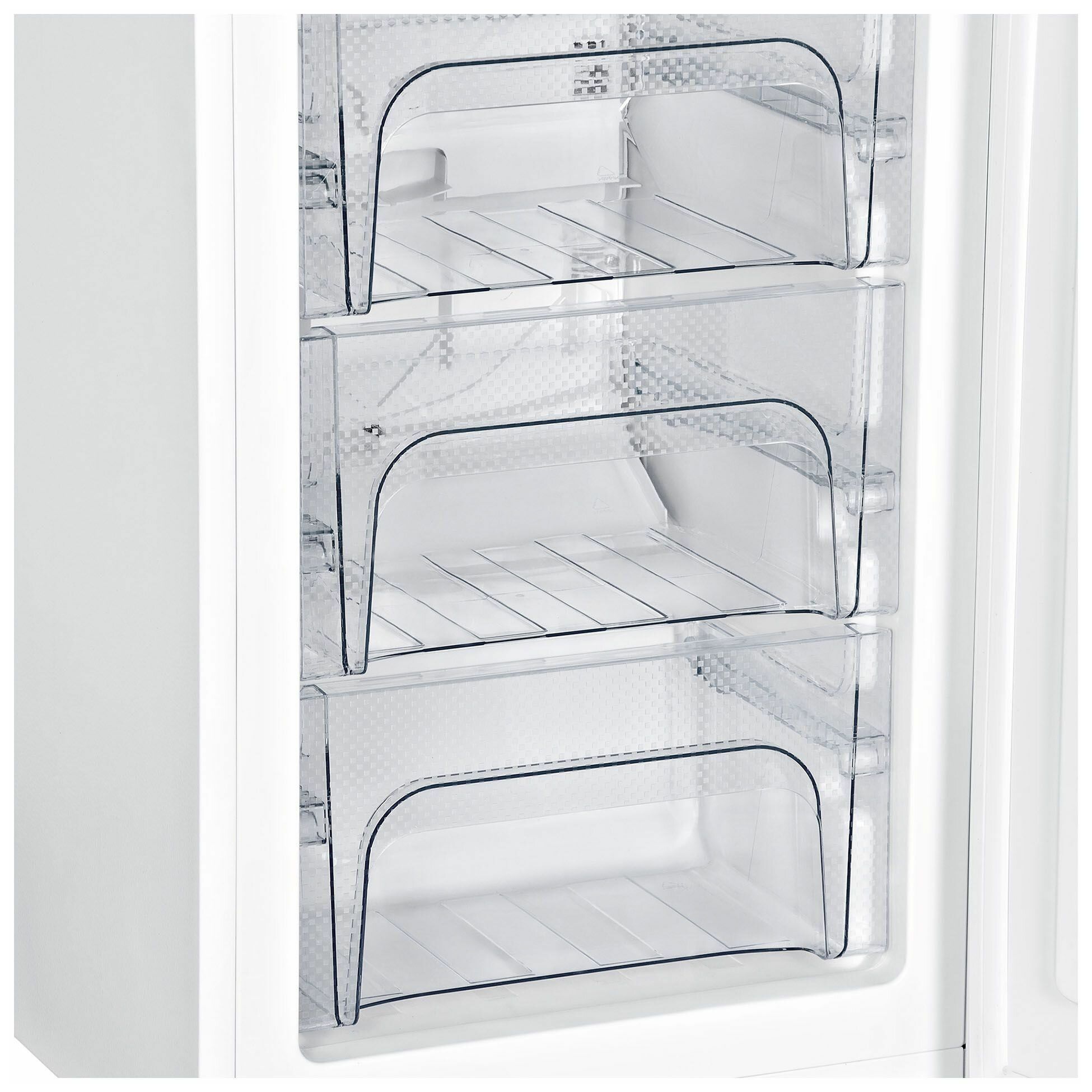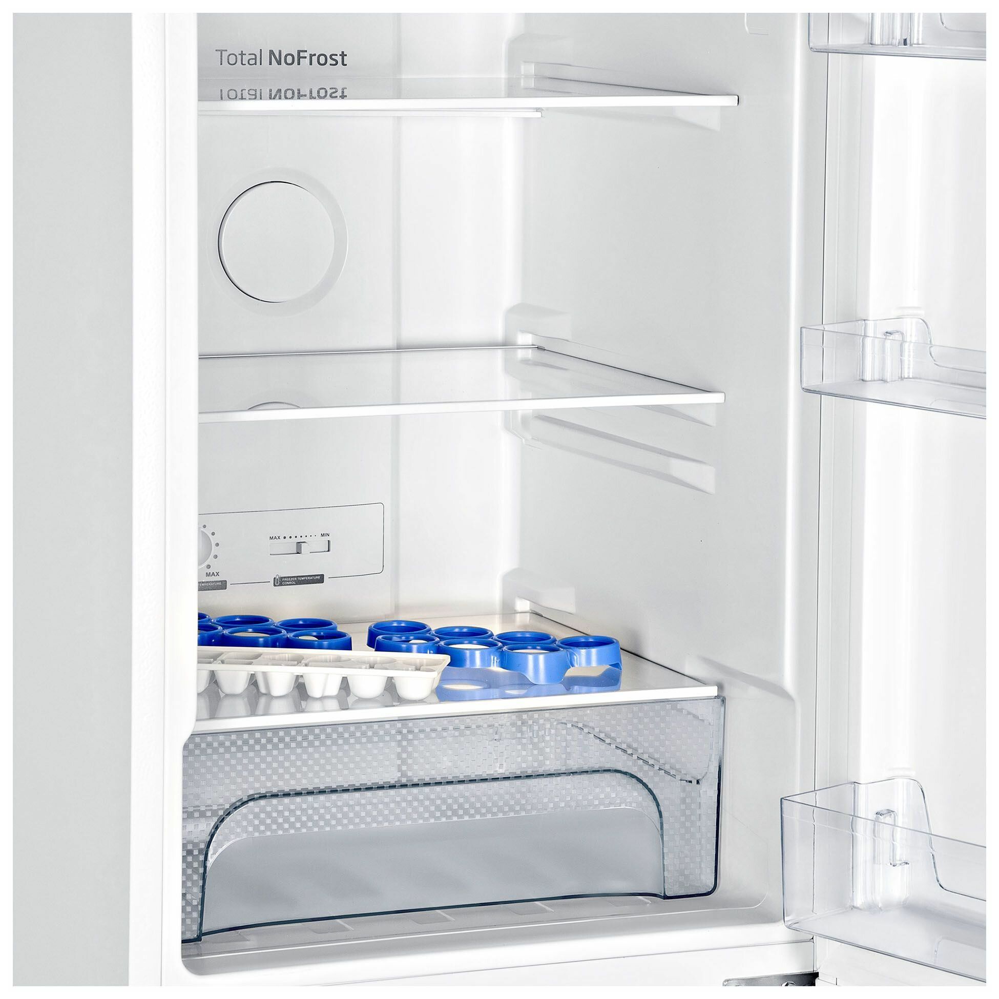 Верхняя камера холодильника оснащена тремя стеклянными полками и одним ящиком, а в нижнюю для удобства установлено просто три выдвижных ящика. Такая конфигурация позволяет эргоно