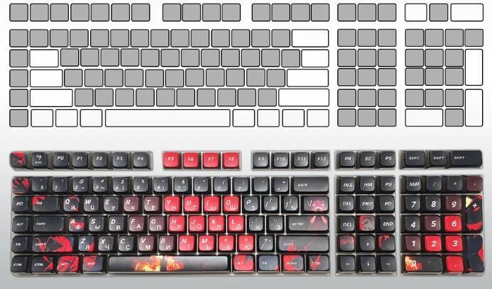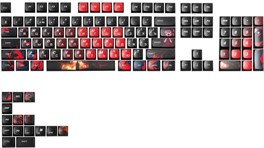 119 клавиш, материал: ПБТ+ПС, кейкапы пудинг, печать на 5 сторонах с помощью термической сублимации, совместим с клавиатурами с 61/68/75/87/98/104/108 клавиш