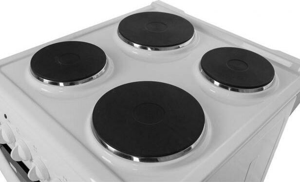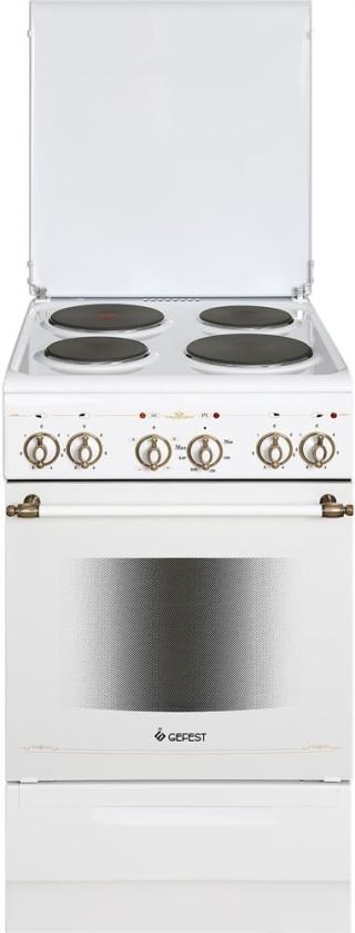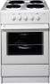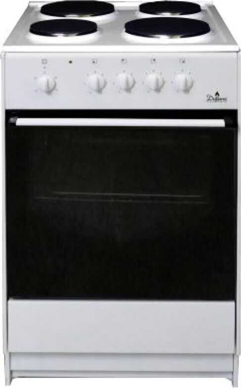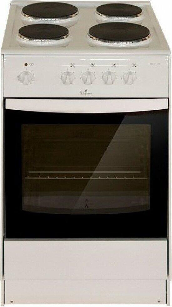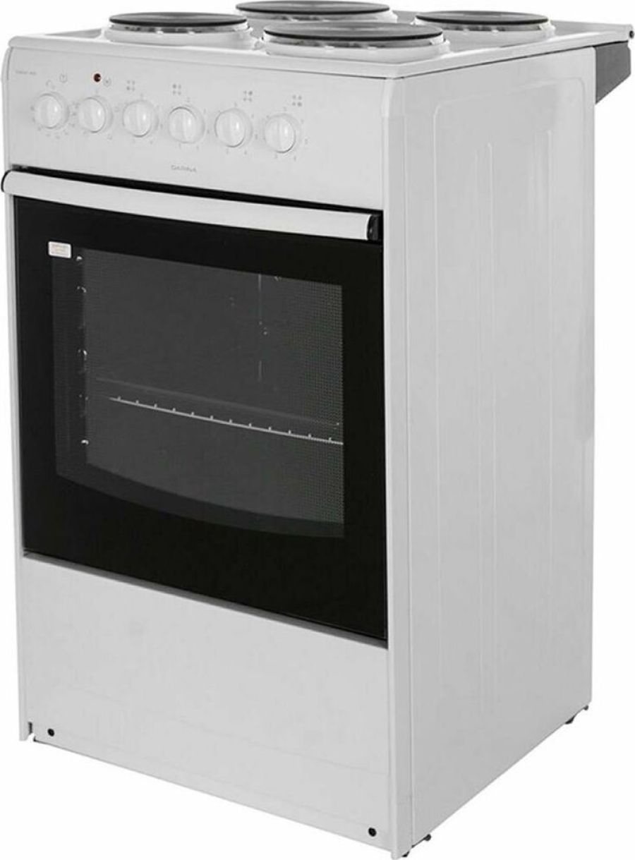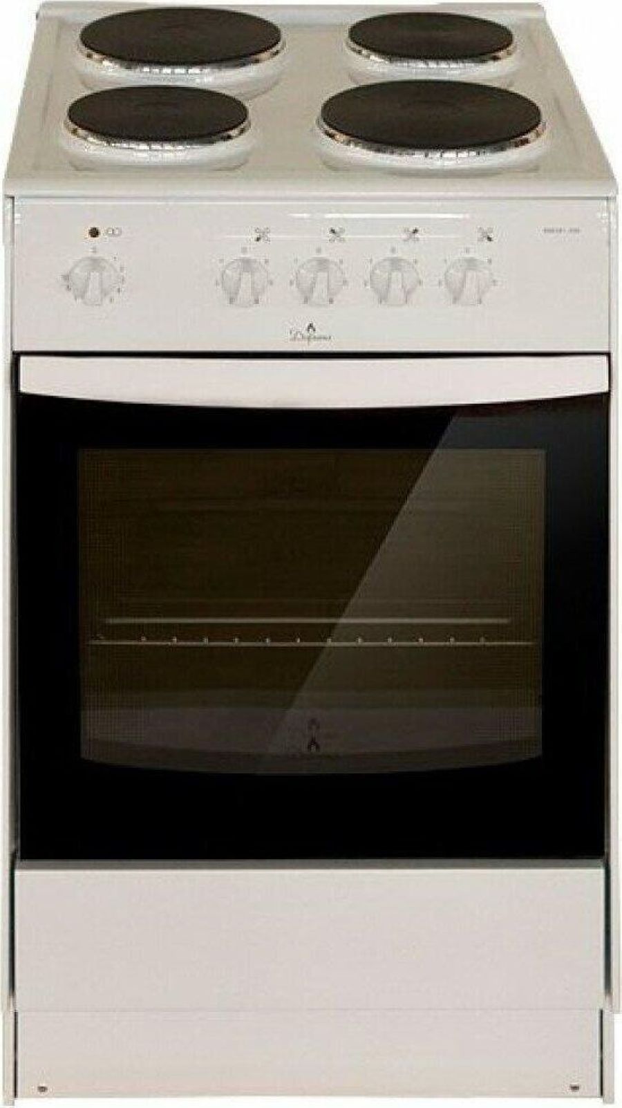 (Ш*Г*В) 50*56*85.Электрика.Цвет-белый.Материал поверхности эмаль.Кол-во конфорок 4. Терморегулятор. Поддон, противень, решетка, дверца съемная с двойным стеклом. Ножки регулировочные.