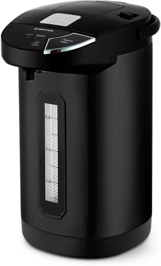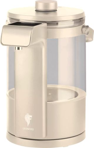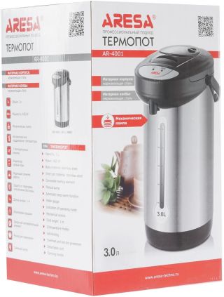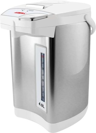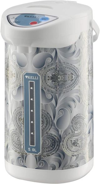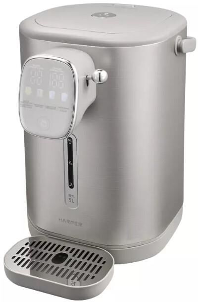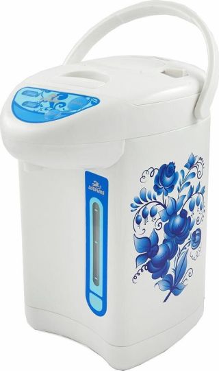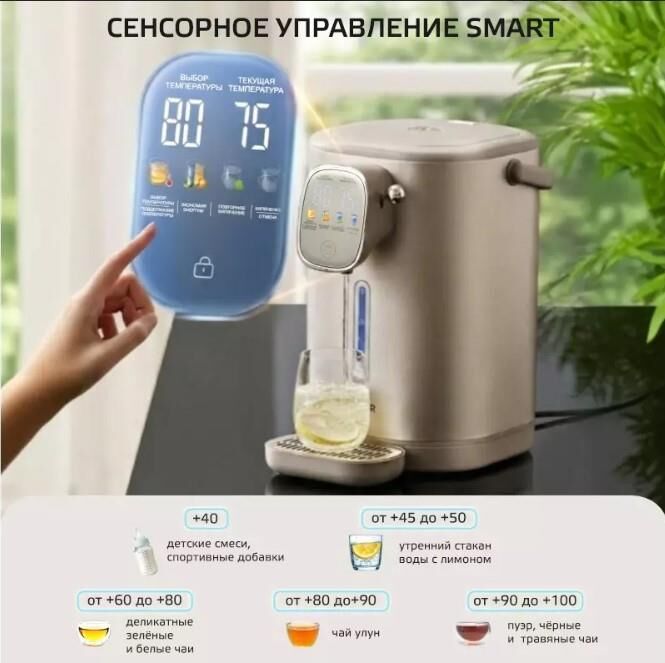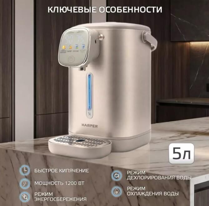 Полезный объем: 5л Потребляемая мощность: 1200 Вт Питание: 220-240В 50-60Гц Поддержание температуры: 40С°, 45С°,50С°,60С°, 70С°, 80С°, 90С°, 100С° Количество температурных режимов: 8 Количество способов подачи воды: 1 Блокировка подачи воды: да Шкала уровня воды: да Автоматическая помпа: да Дисплей: да Сенсорное управление: да Индикация включения: да Индикация заданной температуры : да Индикация текущей температуры: да Индикатор отмены установки температуры: да Индикатор выключения подогрева: да Функция автоматического кипячения: да Функция повторного кипячения: да Режим термоса: да Режим чистой/водопроводной воды: да Защита от перегрева: да Защита от детей: да Съемная крышка: да Защита от включения без воды: да Подставка под чашку: да Материал корпуса: металл / пластик Материал внутренней колбы: Нержавеющая сталь SUS316 Длина сетевого шнура: 1,2м Комплектация: Термопот, подставка, шнур питания, инструкция, гарантийный талон. Цвет: светло-золотистый Размеры (ШхВхГ): 249х341х349 мм Вес: