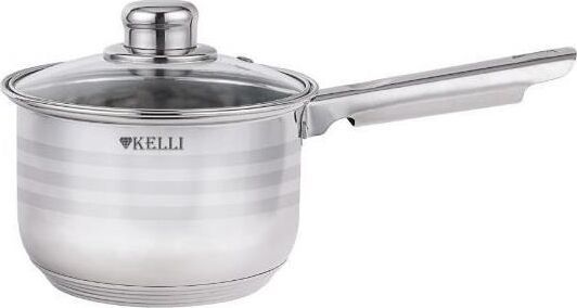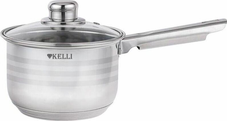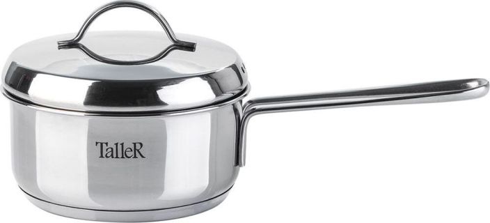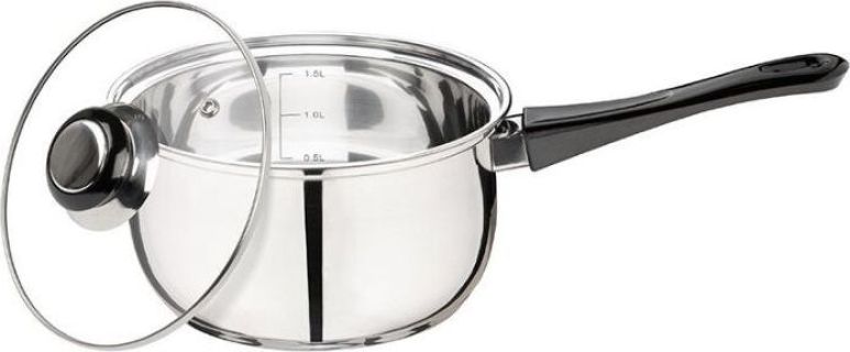 Ковшик Объем: 1,3л. Размер: 14х9,5см. Высококачественная нержавеющая сталь. Капсульное дно. Зеркальная+матовая полировка. Стеклянная крышка с паровыпуском. Удобная термостойкая клепаная ручка. Подходит для всех видов плит.