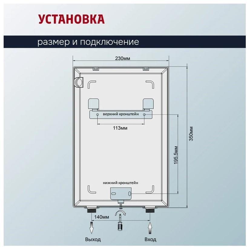 Технические характеристики Primoclima vita 8.5 квт, белый Резьба для подключения воды 1/2 дюйма Мощность 8.5 кВт Напряжение сети 220(230) В Высота 350 мм Глубина 60 мм Ширина 230 мм Мах тем-ра нагрева воды 55 °С Управление электронное Самодиагностика да Пульт ДУ нет Цвет белый Защита от перегрева есть Производительность 7 л/мин Тип ТЭНа сухой Наличие сетевой вилки нет Установка вертикальная Способ крепления настенный Антизамерзание нет Форма прямоугольная Серия VITA Габариты без упаковки 230х350х60 мм Вес нетто 5.3 кг Голосовой помощник нет Степень защиты от воды X4 IP Дисплей есть Индикация включения есть Нагревательный элемент ТЭН Способ подачи воды напорный Подводка нижняя