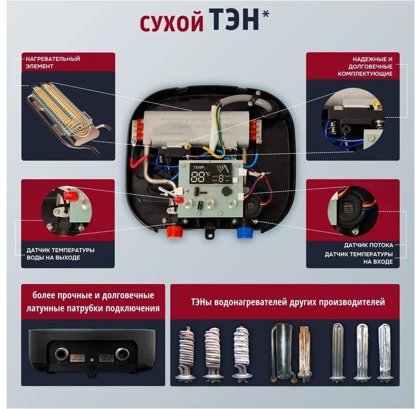 Технические характеристики Резьба для подключения воды 1/2 дюйма Мощность 5.5 кВт Напряжение сети 220(230) В Высота 230 мм Глубина 70 мм Ширина 250 мм Мах тем-ра нагрева воды 55 °С Управление сенсорное Самодиагностика да Цвет черный Защита от перегрева есть Производительность 5 л/мин Ограничение температуры нагрева есть Тип ТЭНа сухой Наличие сетевой вилки нет Установка вертикальная Способ крепления настенный Антизамерзание нет Форма прямоугольная Серия THERMA Габариты без упаковки 250х230х70 мм Вес нетто 3 кг Степень защиты от воды IPX4 IP Дисплей есть Индикация включения есть Способ подачи воды напорный Подводка нижняя