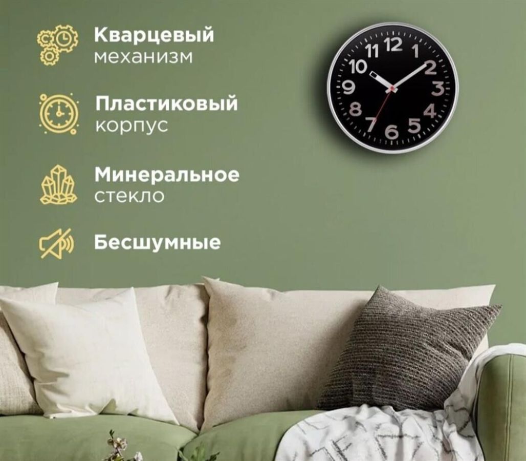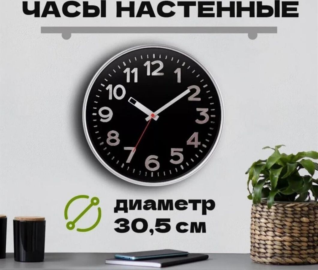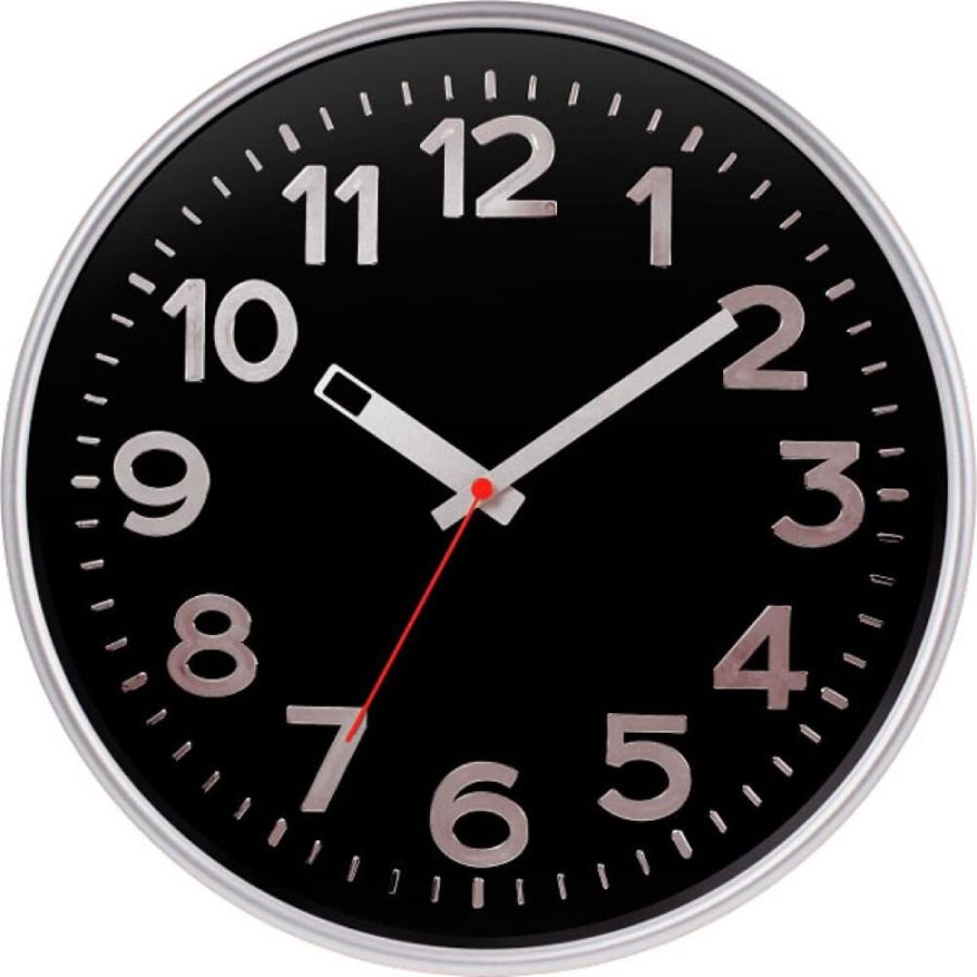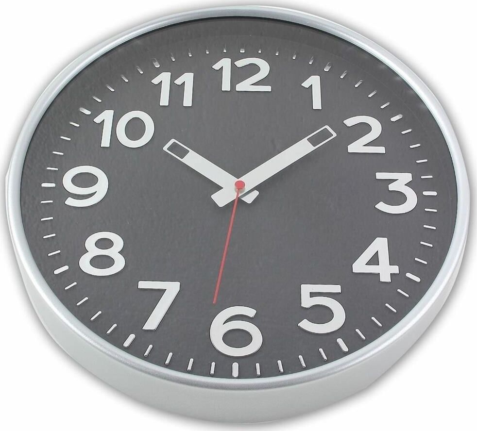 Часы настенные пластиковые, модель 78777782, размер 305*305*50 мм, стекло минеральное, пластиковый обод, цвет-серебро, рельефные цифры с тиснением фольгой под серебро.