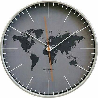 Форма — круг. Материал корпуса — пластик. Цвет корпуса — серебро. Защита циферблата — силикатное стекло. Особенности — печать на стекле. Вывод времени — стрелочный. Механизм — кварцевый с плавным ходом. Батарейка АА (в комплект не входит). Гарантийный срок — 12 мес.