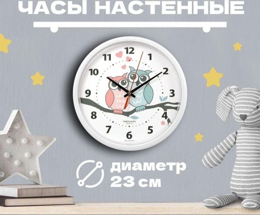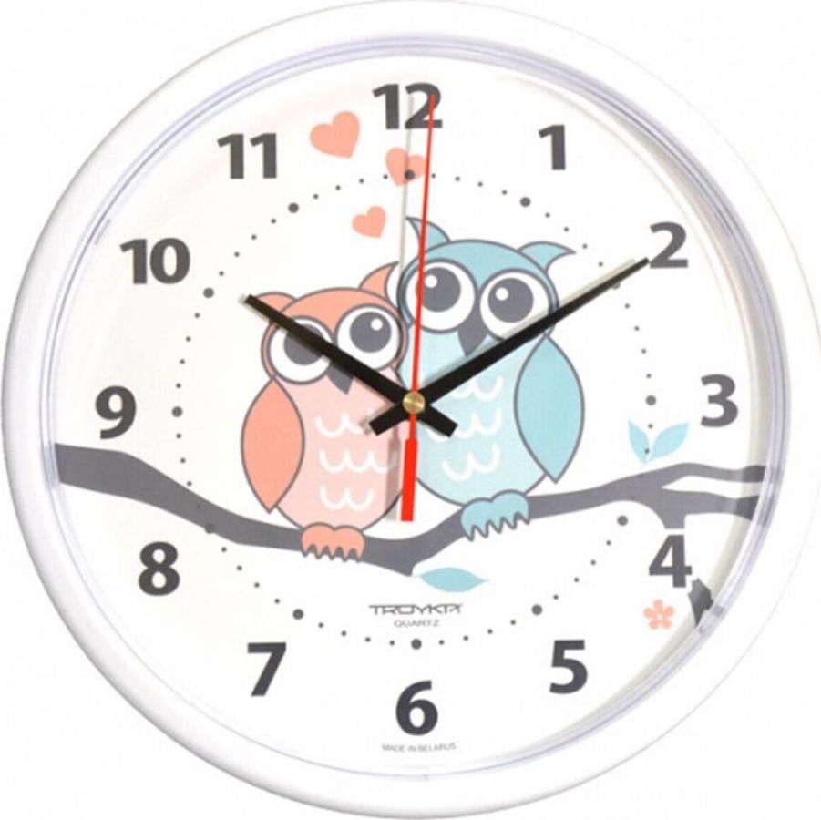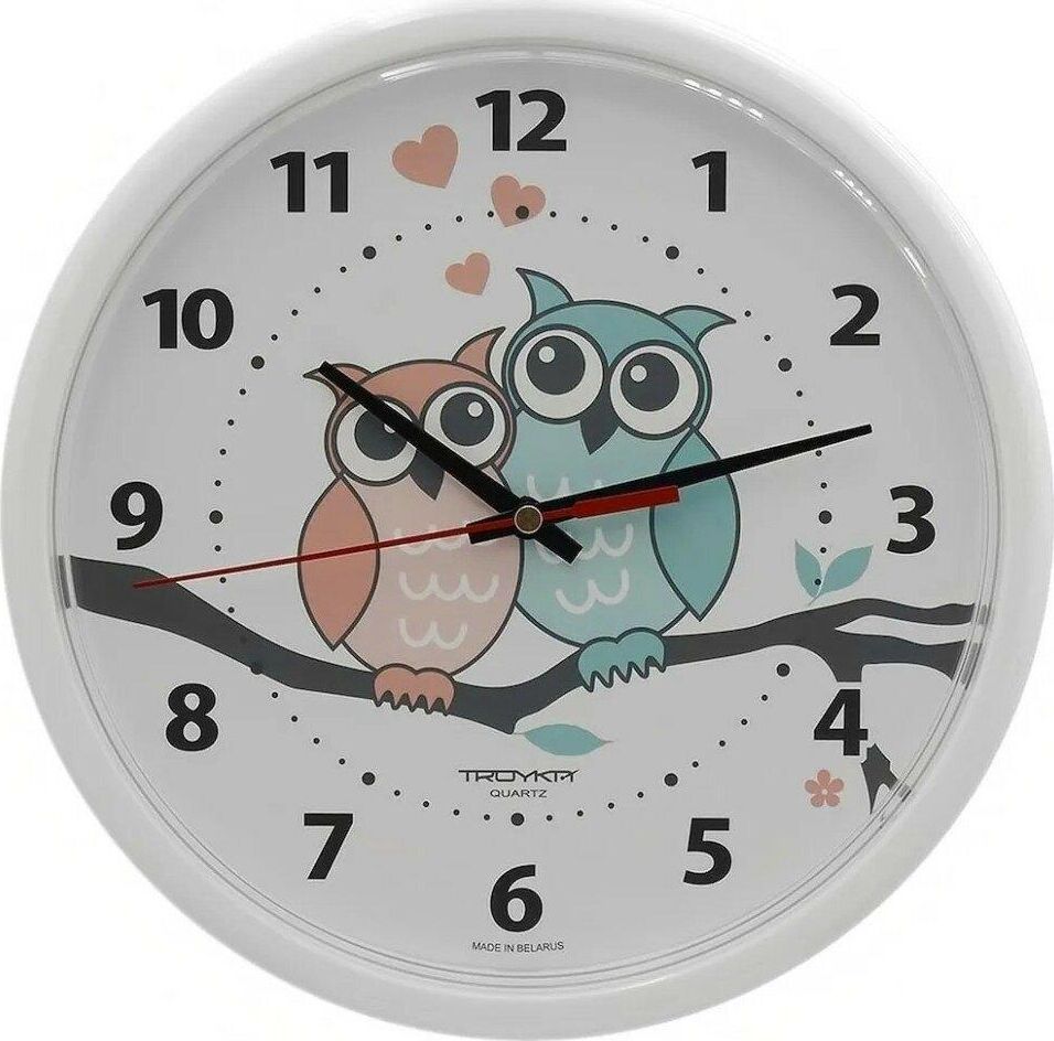 TROYKA 91910931 часы настенные (Совы, круг белый, пластик)ДИАМЕТР 230ММ.ПЛАСТИКОВЫЙ КОРПУСПЛАСТИКОВОЕ СТЕКЛОКВАРЦЕВЫЙ МЕХАНИЗМ С ПЛАВНЫМ ХОДОМ