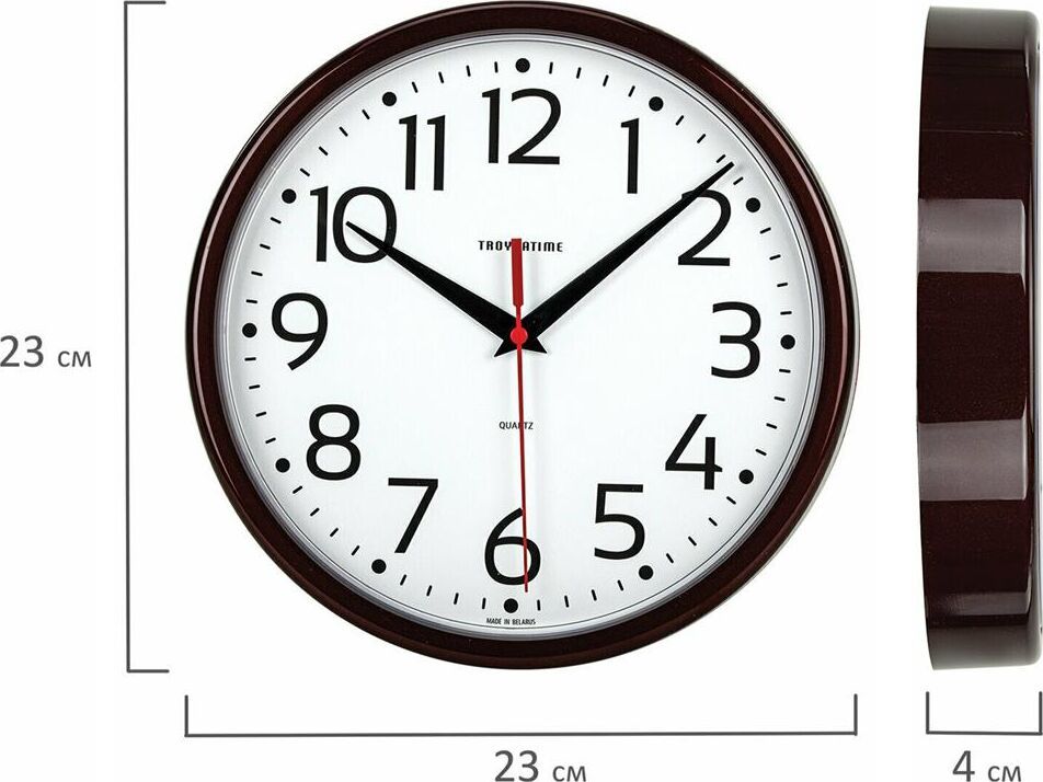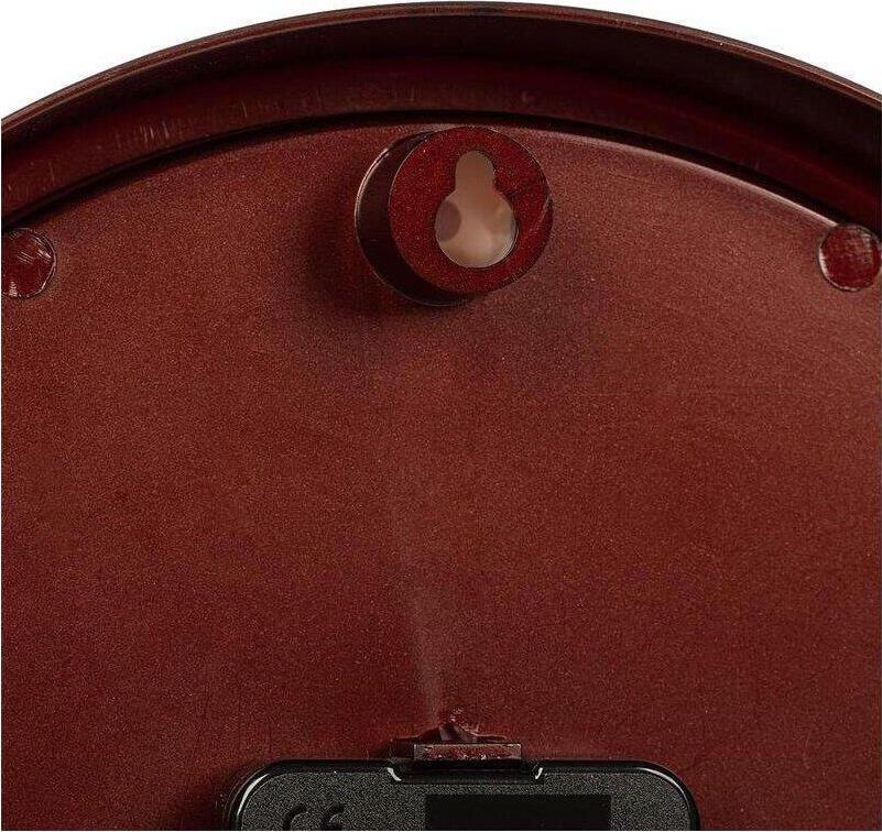 Категория: настенные, Тип механизма: кварцевый, Материал корпуса: пластик, Точный размер корпуса: 225х225х40 мм, Форма корпуса: круглые, Цвет корпуса: коричневый, Цвет циферблата: белый, Циферблат: стрелочный, Цифры: арабские, Ход: плавный.
