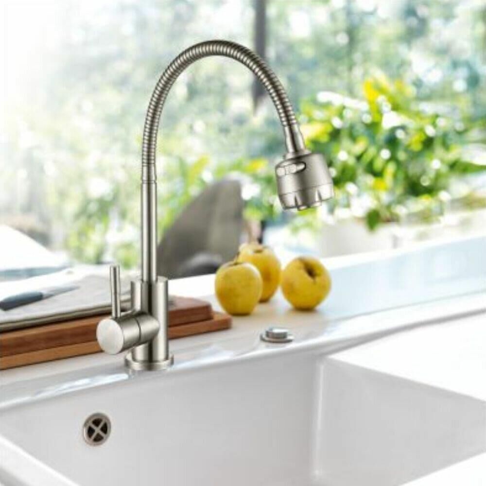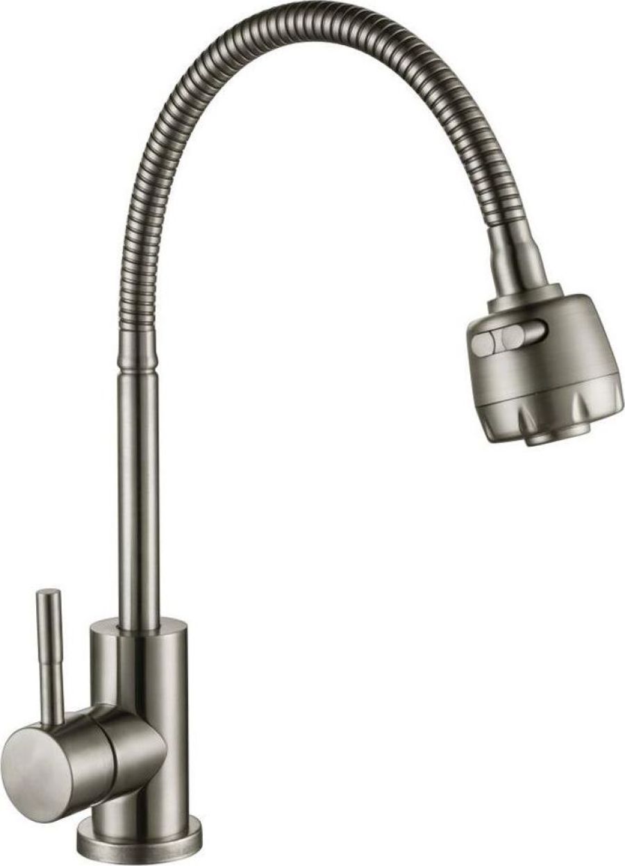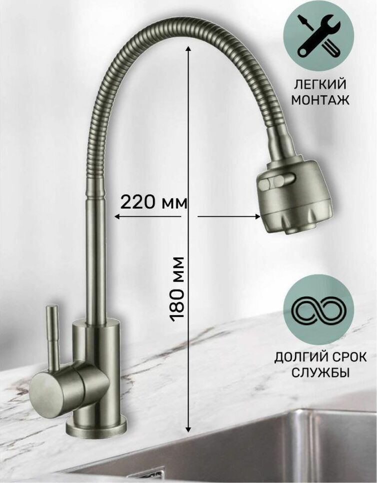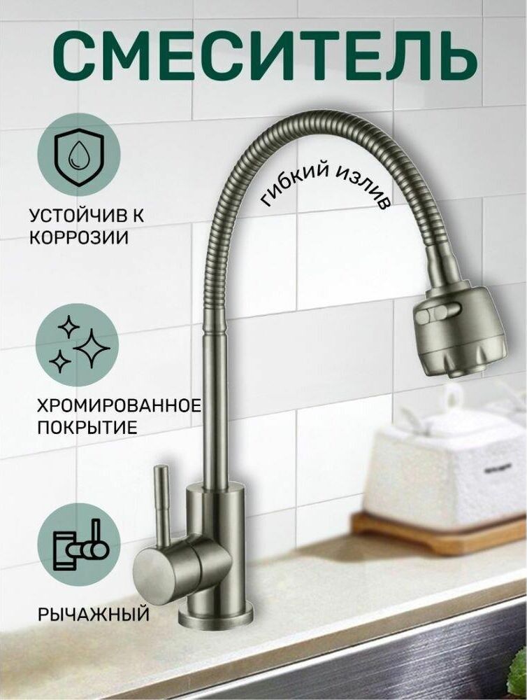 Смесители для кухни ТМ Антей серии Булат с гибким изливом изготовлены из нержавеющей стали SUS304. Аэратор с двумя режимами струи, керамический картридж d35мм обеспечивает плавный ход ручки, монтажный комплект - гайка.
