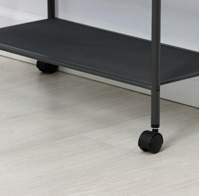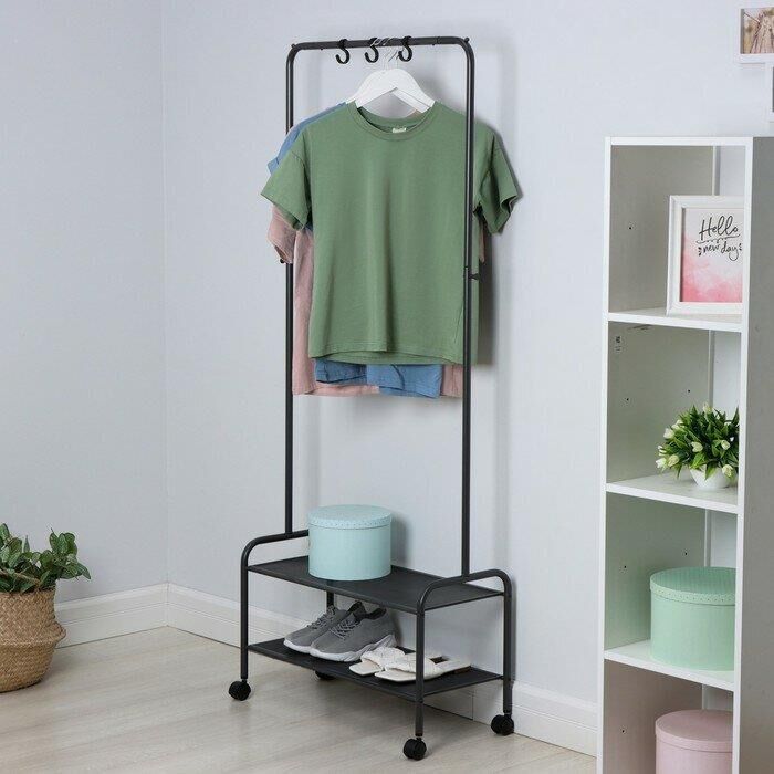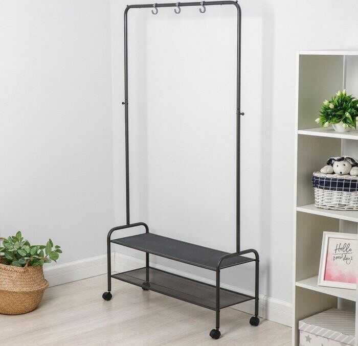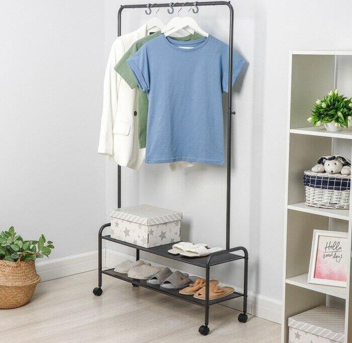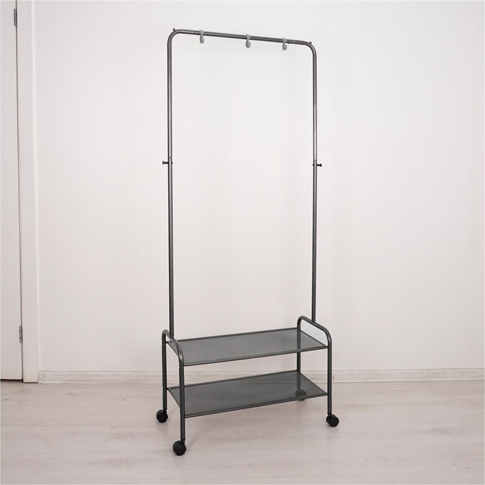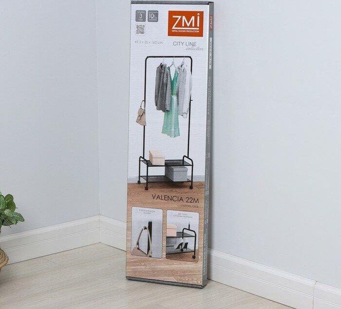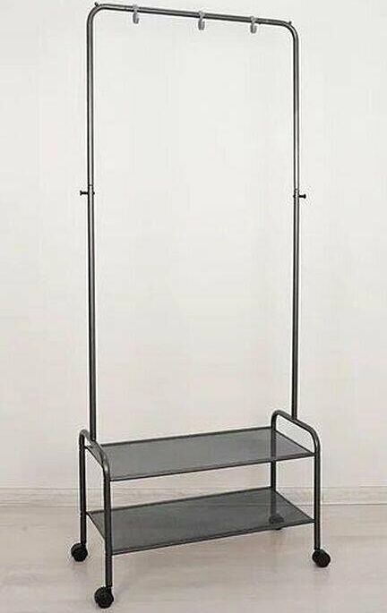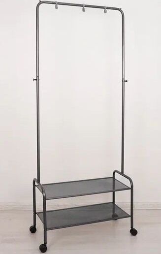 Назначение Для размещения одежды. Материал Труба диаметром 18 мм, стальные шарики; пластиковые подпятники, полимерно-порошковое покрытие, пластик. Габариты (Д*Ш*В) 69,5х31х162 см.