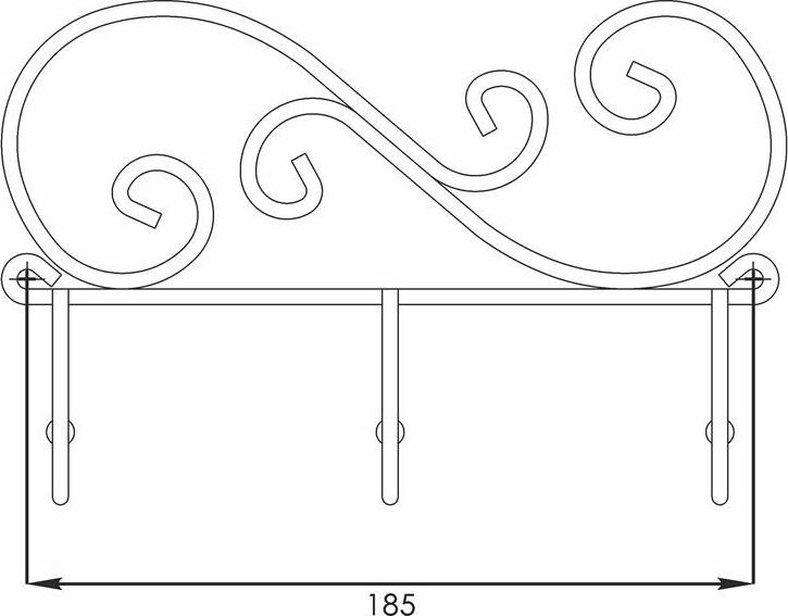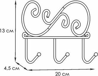Надежная сварная конструкция. - компактная вешалка с 3-мя крючками. - допустимая нагрузка до 5 кг на крючок. - Расстояние между крепёжными отверстиями 185 мм. Материал Проволока диаметром 4 мм; стальные шарики; полимерно-порошковое покрытие. Габариты (Д*Ш*В) 20х4,5х13 см.