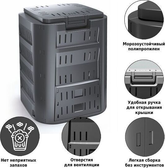 Компактный 320-литровый компостер Compogreen IKL320C – это эффективный и надежный инструмент для компостирования. Изделие имеет удобную ручку для закрывания крышки, а в нижней части – откидные створки, которые обеспечивают постоянный доступ к готовому удобрению. • Размер: 70х70х80 см • Вес нетто: 4,93 кг • Объём: 320 л • Материал: полипропилен • Наличие дна: нет • Цвет: черный • Упаковка: стрейч-лента • Размер упаковки: см • Вес брутто: кг • Производитель: Prosperplast • Страна: Польша