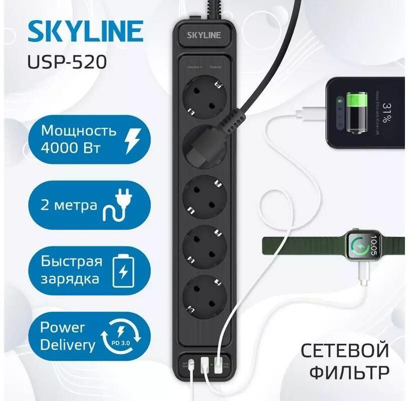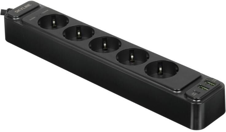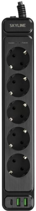 Сетевой фильтр с 2xUSB+1xType-C портами; Розетки 5 шт.; Длина кабеля 2 метра; Цвет черный; Максимальная мощность 4000W (16A); 2xUSB, 1xType-C (Максимальная суммарная сила тока: 3 А), поддержка QC/PD; Защитные шторки, Защита от перегрузки и короткого замыкания, Индикатор работы, Индикатор заземления; Стильный лаконичный дизайн; Огнеупорный пластик; Питание AC 220-250V 50Hz.