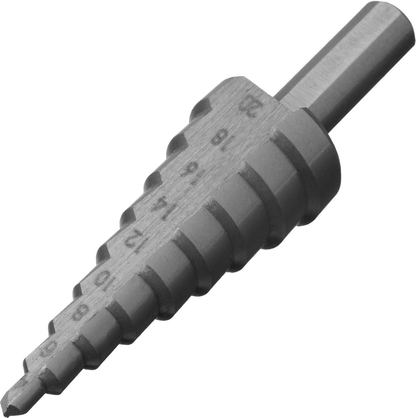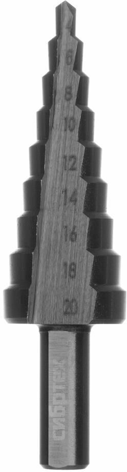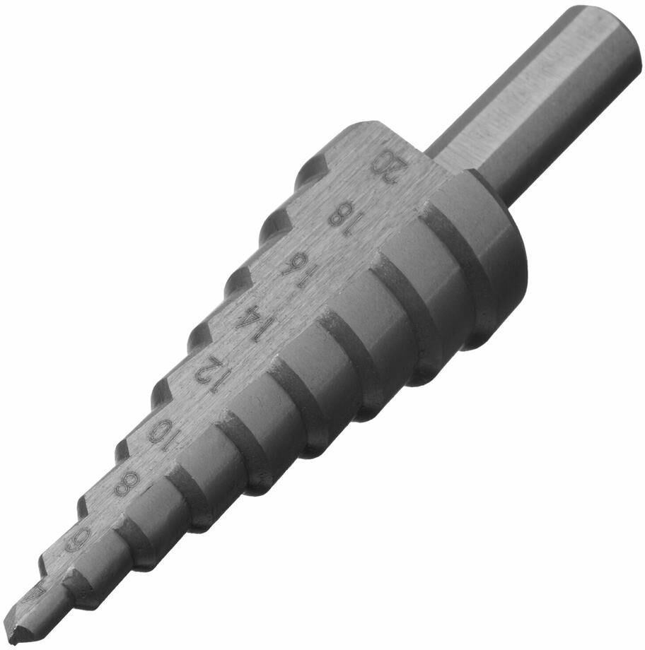 Ступенчатое сверло Сибртех 723012 предназначено для сверления отверстий диаметром от 4 до 20 мм в сталях, цветных металлах и пластике. Избавляет от необходимости иметь при себе целый набор традиционных сверл. Позволяет получать отверстия с ровными краями и уже снятой фаской под гайку или болт. Сверло пригодится дома и в мастерской.