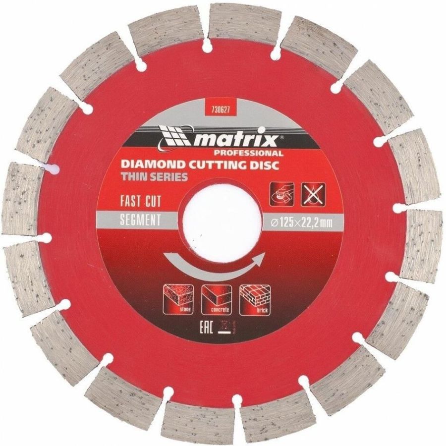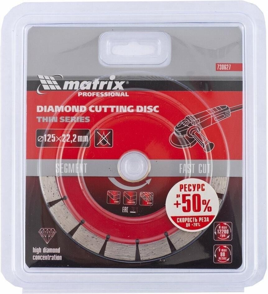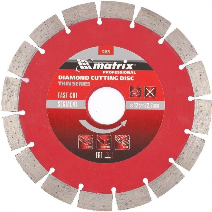 Отрезной сегментный алмазный диск Matrix ф125х22,2 мм 730627, тонкий, позволяет проводить сухое резание свежего и старого бетона, камня, гранита, шлакоблока, тротуарной плитки, песчаника и кирпича с помощью УШМ. Его можно использовать как в частной мастерской, так и на стройке для решения профессиональных задач. Тонкий корпус диска способствует снижению нагрузки на инструмент, позволяя ускорить рабочий процесс на 20%.Преимущества16 сегментов позволяют быстро проводить работы по различным материалам без водяного охлаждения диска.За счет ширины режущего слоя 10 мм и высокой концентрации алмазов диск быстро разрезает материалы без риска преждевременного износа.Плотная металлическая связка отлично удерживает алмазы, обеспечивая их равномерное истирание, своевременную раскрываемость и полную выработку.Технология ускоренного горячего прессования делает диск устойчивым к высоким нагрузкам и износу.