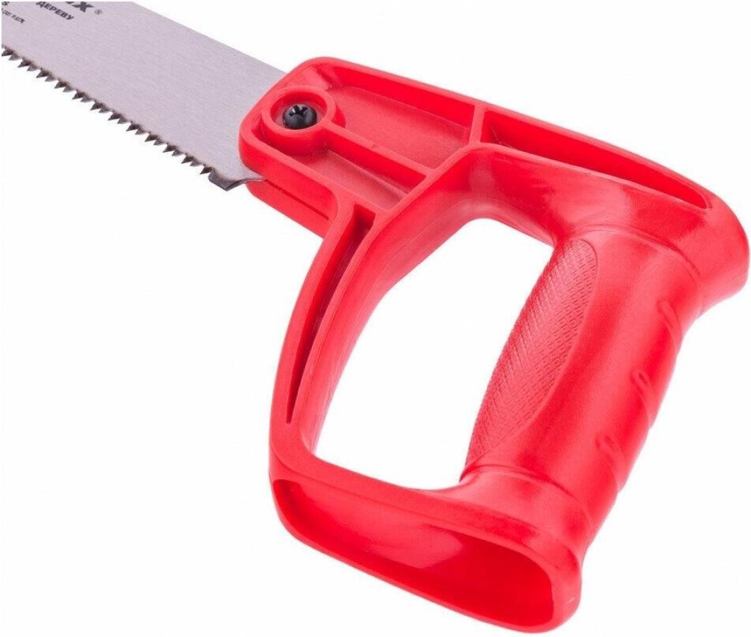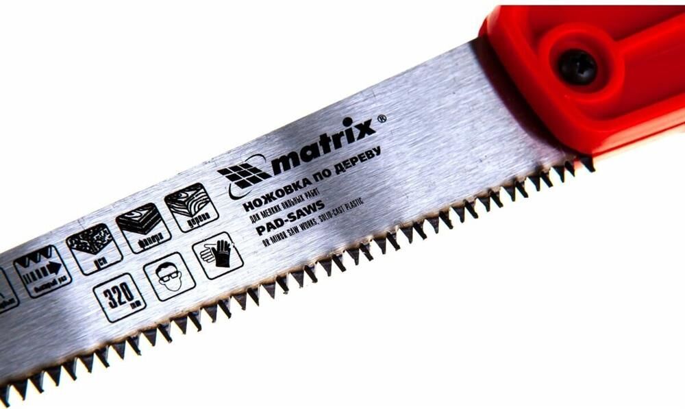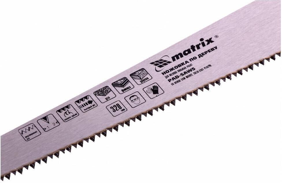 Ножовка по дереву Matrix 23106 с полотном длиной 320 мм, с цельнолитой однокомпонентной рукояткой, предназначена для мелких пильных работ и используется в столярном деле. Зубья с двухгранной заточкой имеют шаг 8 TPI, что обеспечивает быстрый рез. Если режущая кромка затупится, ее можно переточить. Ножовкой пилят древесину, фанеру и ДСП.ПреимуществаПолотно обладает высокими прочностными характеристиками и хорошо сохраняет прямолинейность, поскольку изготовлено из пружинной стали 65Mn.Режущая часть долго сохраняет рабочие свойства, поскольку ее зубья закалены.Поверхность полотна защищена от коррозии лаковым покрытием.Цельнолитая пластиковая рукоятка не скользит в ладони, т.к. имеет рельефную поверхность.Высокое качество инструмента подтверждено производителем, осуществляющим строгий контроль на всех этапах производства.