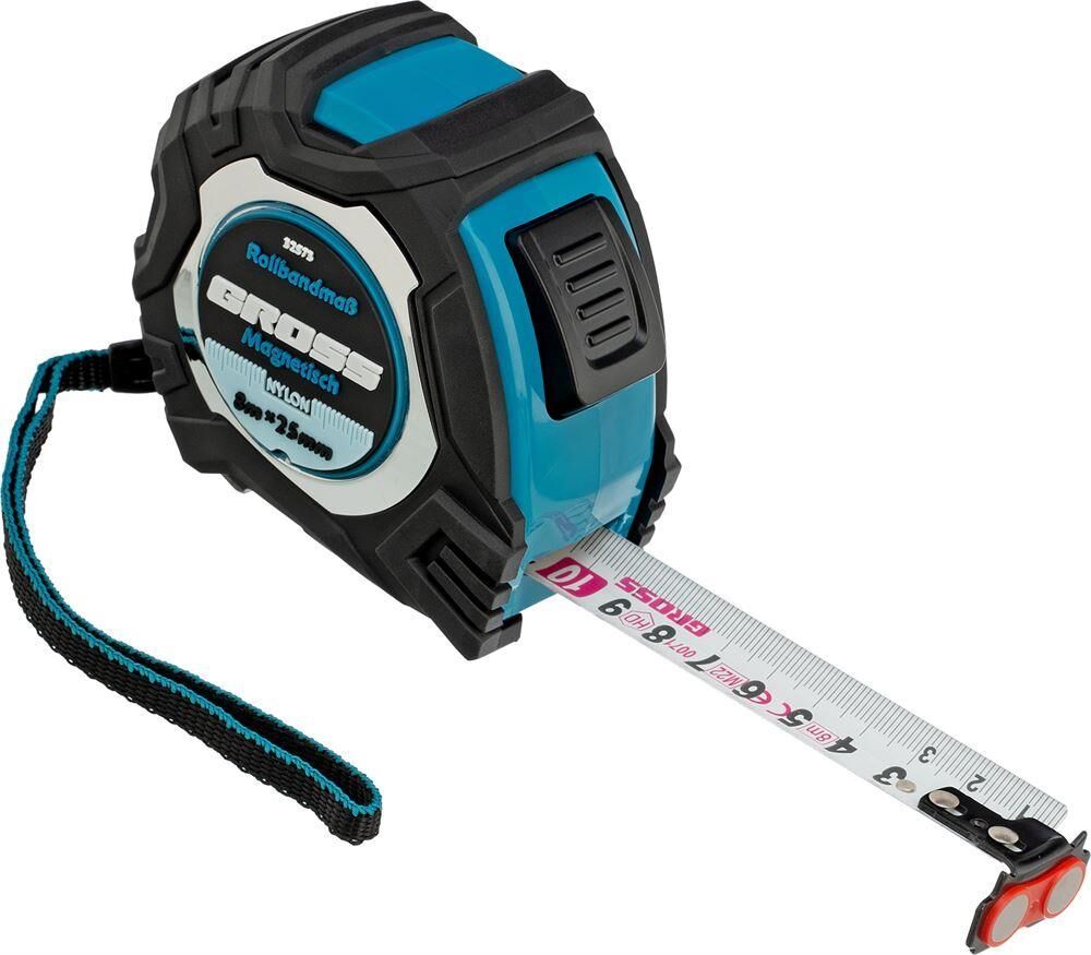 Рулетка Gross «Magnetisch» 32573 в обрезиненном корпусе, с полотном размером 8 м х 25 мм, магнитным зацепом, нейлоновым покрытием и функцией автоматической фиксации, используется во время ремонтных и строительных работ. Оптимальна для измерения стен, полов, различных заготовок, мебели, оконных проемов и т.д. Благодаря магнитному зацепу рулетку удобно использовать для работы с металлическими поверхностями, а широкое упругое полотно облегчает проведение замеров в труднодоступных местах.ПреимуществаНадежность — обрезиненный корпус устойчив к повреждениям, выдерживает случайные падения с небольшой высоты.Износостойкость — нейлоновое покрытие защищает измерительное полотно от истирания.Функциональность — лента автоматически фиксируется в вытянутом положении и возвращается в корпус только после нажатия кнопки.Точная работа — подвижный зацеп позволяет не учитывать его толщину при выполнении измерений с нуля.
