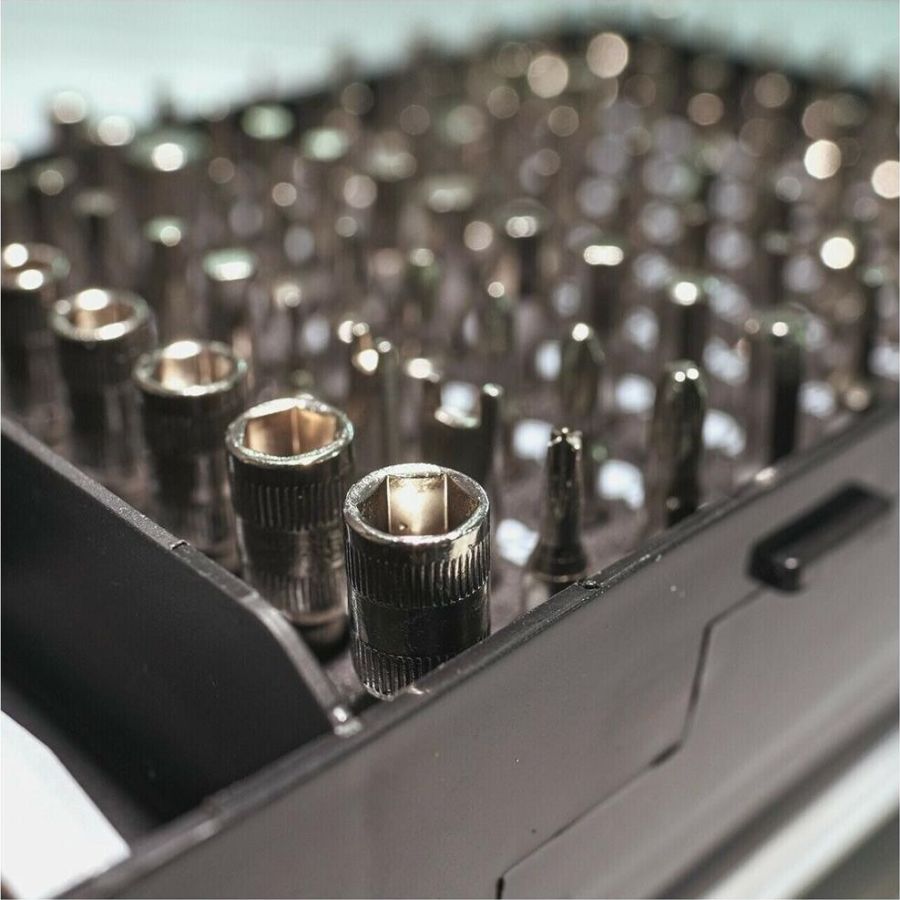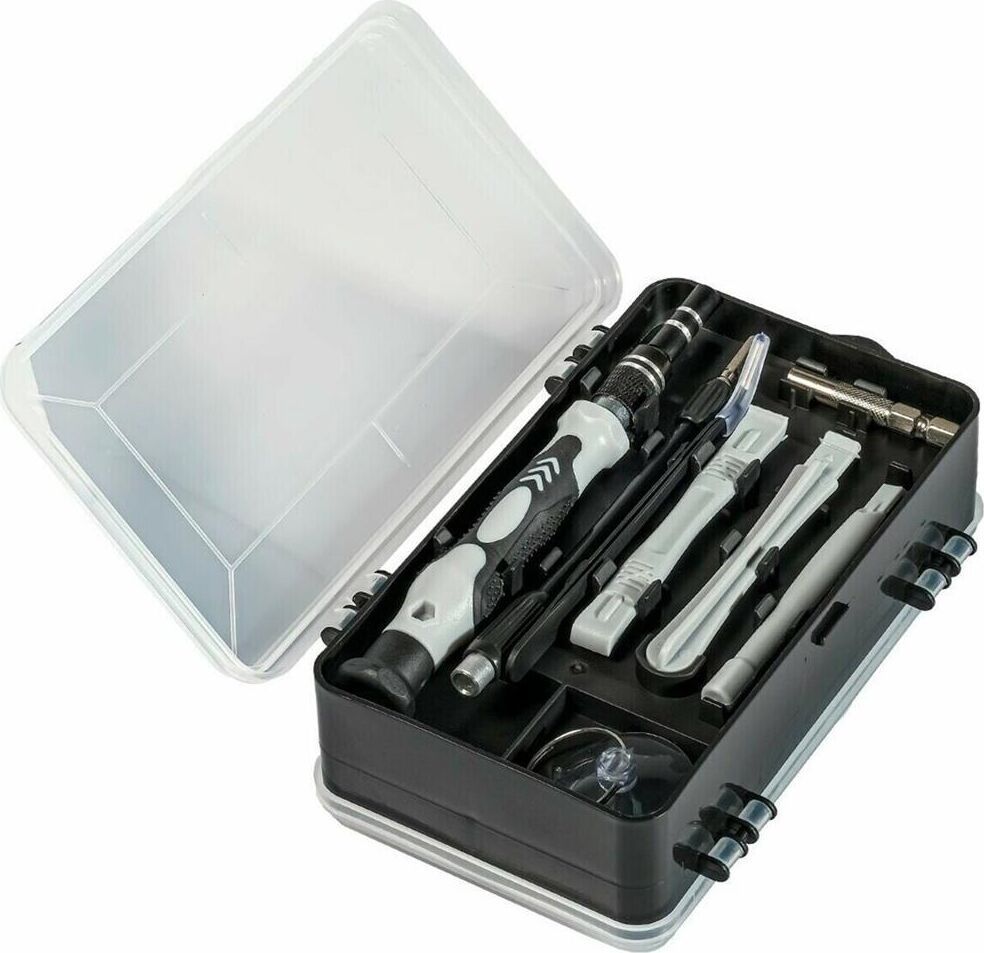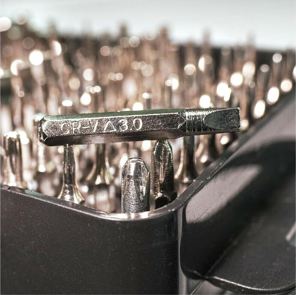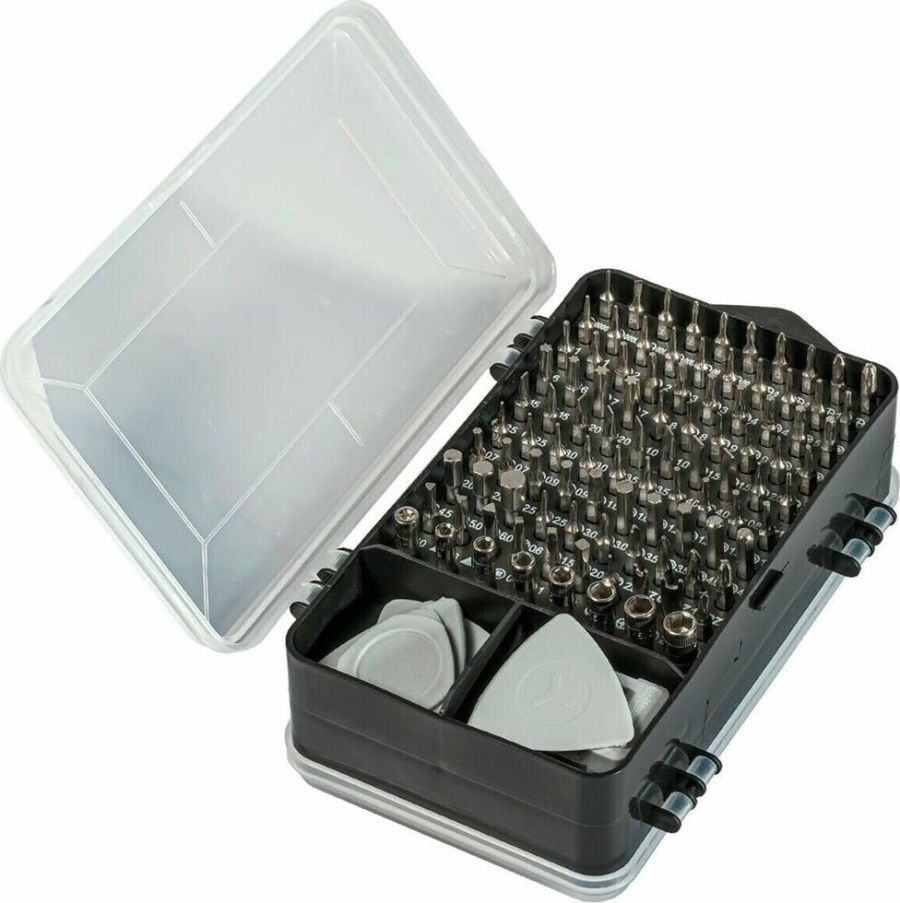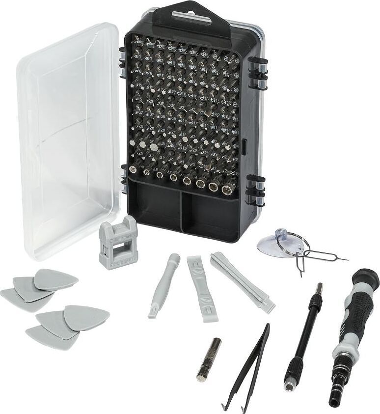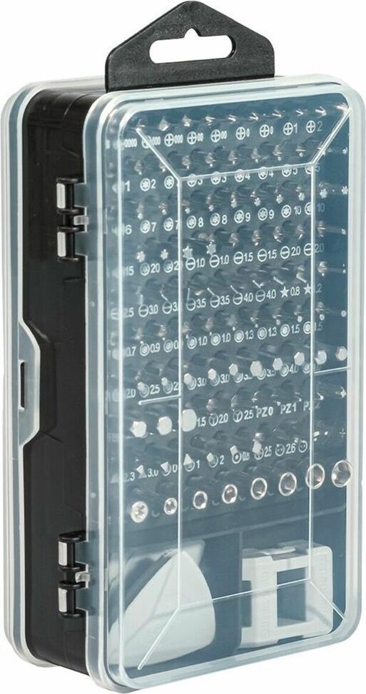 Материал: Сталь CrV. Предметов в наборе, шт: 117. Отвертка-держатель для бит (1 шт) Гибкий вал (1 шт) Держатель для бит (1 шт) Пинцет (1 шт) Лопатка (3 шт) Ключ для SIM карты (2 шт) Магнит (1 шт) Присоска (1 шт) Медиатор (6 шт) Биты 25 мм (98 шт) Удлинитель для бит (1 шт) Кейс (1 шт)