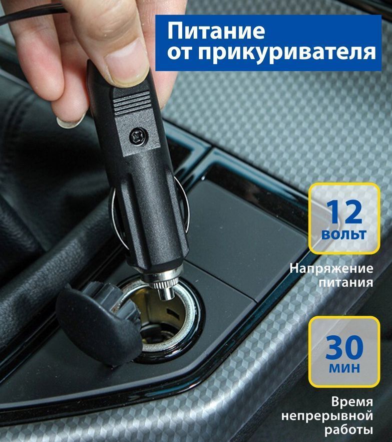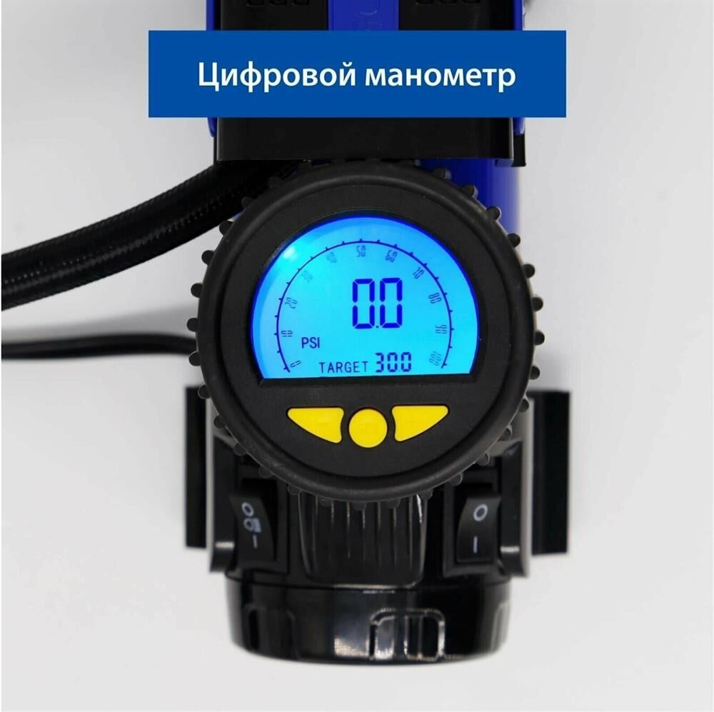 Воздушный компрессор 35 л/мин с цифровым манометром, питание от прикуривателя, светодиодный фонарь, сумка для хранения. Цифровой манометр. Система контроля давления. Накачивает колесо R-16 за 4 минуты. Светодиодный фонарь. Сумка и набор переходников в комплекте. Компрессор - 1 шт. Набор переходников - 1 шт. Сумка для хранения - 1 шт. Инструкция - 1 шт. " Производительность - 35 л/мин. Мощность - 168 Вт. Максимальное давление - 10 Атм. Максимальное токопотребление - 14 А. Время непрерывной работы - 30 мин. Напряжение питания - 12 В. Длина провода питания: 3 м. Длина воздушного шланга: 1 м