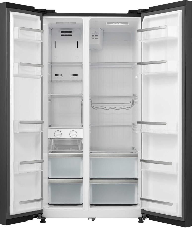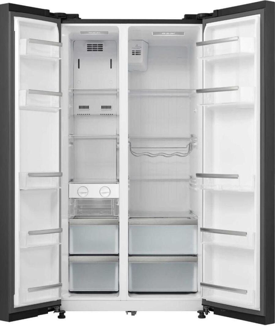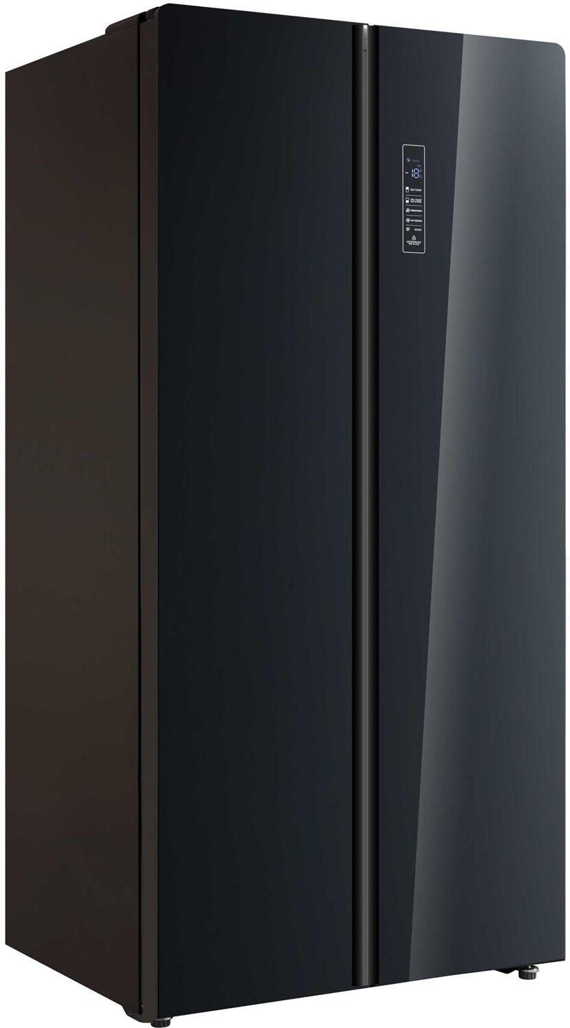 Холодильник Side-By-Side; Габариты (ВхШхГ): 178,8х89,5х74,5 см; Сенсорное управление Smart Touch, Full NO FROST, Dynamic Air Cooling; Режимы «Супер заморозка», «Супер охлаждение»; LED освещение камеры; 2 ящика для овощей; Полки из закаленного стекла; Держатели для бутылок; Контейнер для льда; Объем холодильного отделения: 335 л; Объем морозильного отделения: 175 л; Цвет: черное стекло; Класс энергопотребления: A+