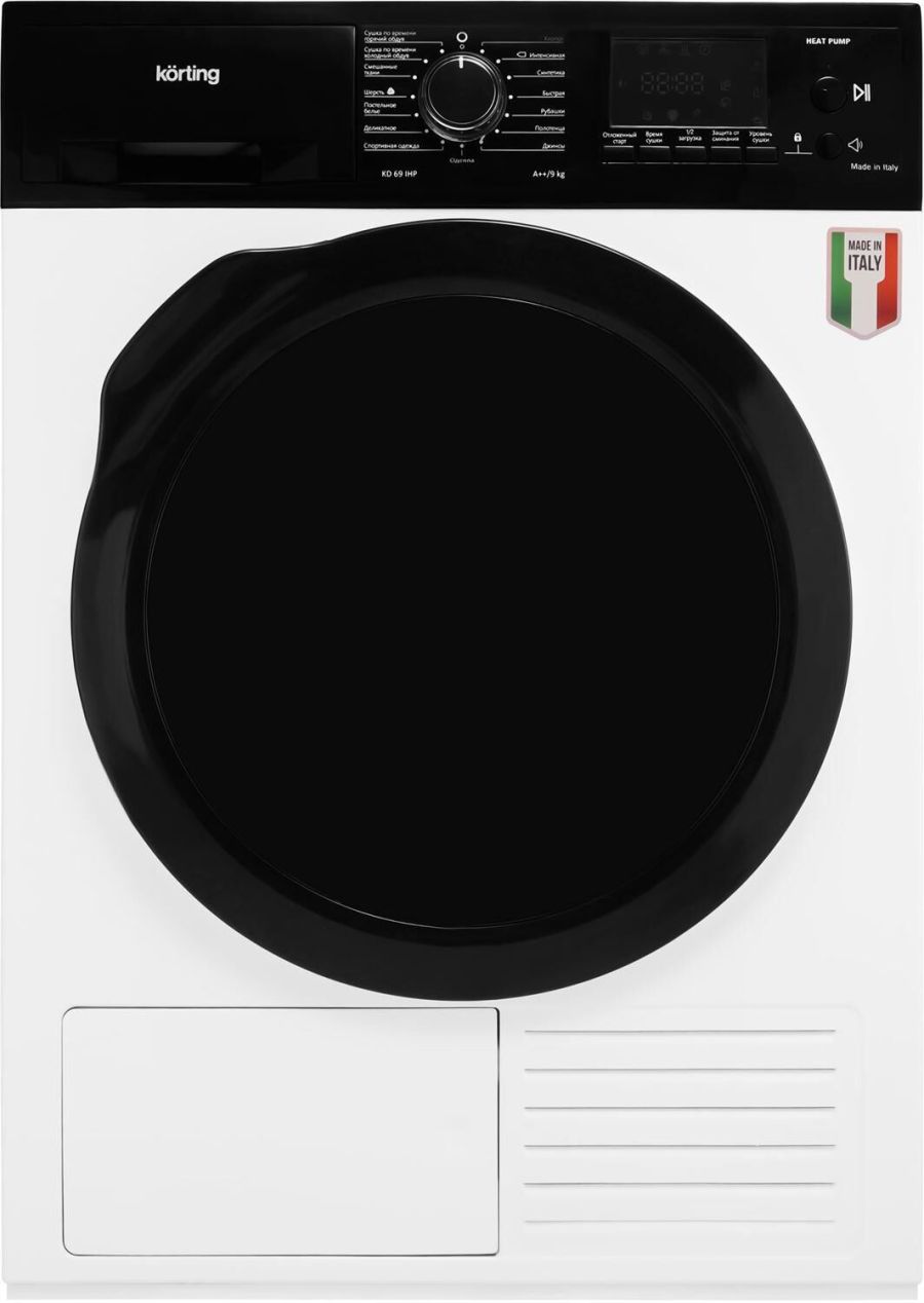Сушильная машина HEAT PUMP с тепловым насосом; Габариты (ВхШхГ): 84х59,6х63 см; Загрузка: 9 кг; Электронное управление; Цифровой дисплей с отображением времени до окончания программы; LED индикация настроек и дополнительных функций; 15 программ; Отложенный старт до 24-х часов; Сушка по времени; Сушка по остаточной влажности; Функция: "защита от сминания"; Деликатная сушка; Половинная загрузка; Функция "Защита от детей"; Съемный резервуар для слива конденсата; Индикация заполнения резервуара; Индикация загрязнения фильтра; Защитная крышка люка; Съемная корзина-держатель в комплекте; Цвет: белый; Класс энергопотребления: A++