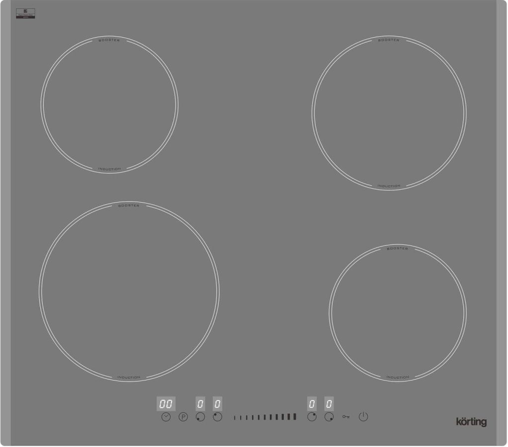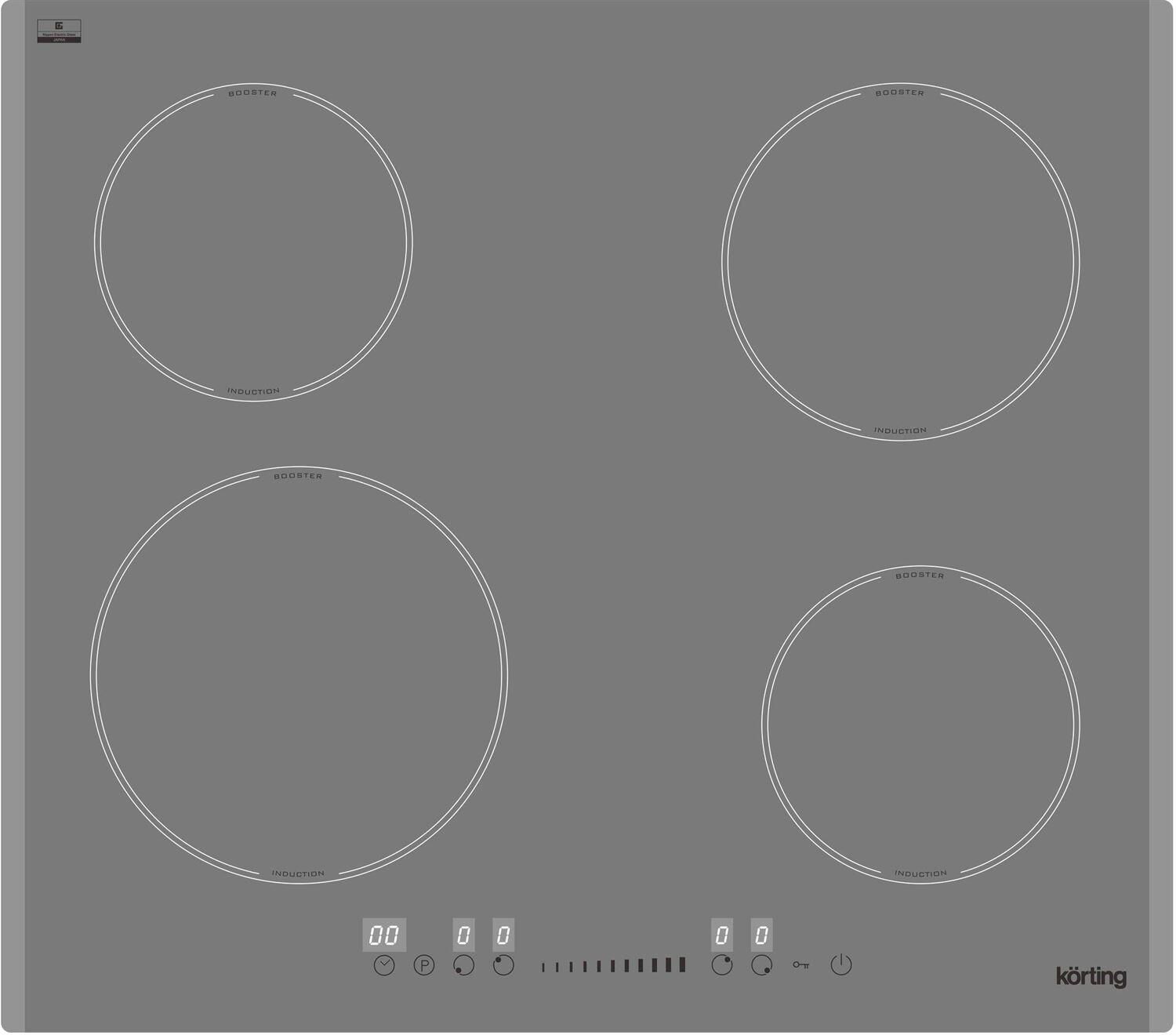 Индукционная варочная панель; Ширина: 60 cм, сенсорное управление Slider Touch, 4 индукционные зоны приготовления, LED индикация для каждой зоны, Таймер, Функция "Защита детей", Автоматическое отключение, Индикация остаточного тепла, Booster для всех зон, TWIN Booster для 1ой зоны, Цвет: серый, Дизайн рамки: 2 скошенных края