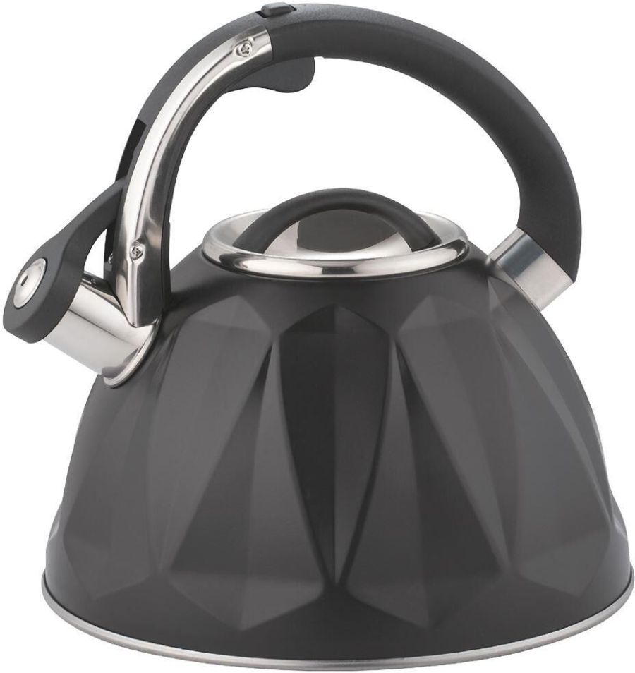 Чайник со свистком, 3,0 л, нержавеющая сталь, КАПСУЛИРОВАННОЕ ИНДУКЦИОННОЕ ДНО, КУРКОВЫЙ МЕХАНИЗМ, внешнее антипригарное декоративное покрытие, устойчивое к высоким температурам; комбинированная фиксированная ручка.