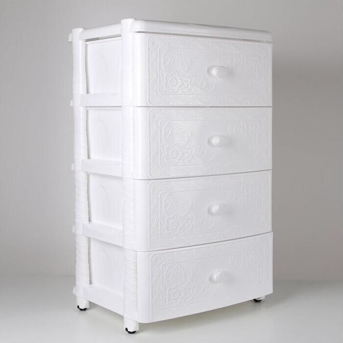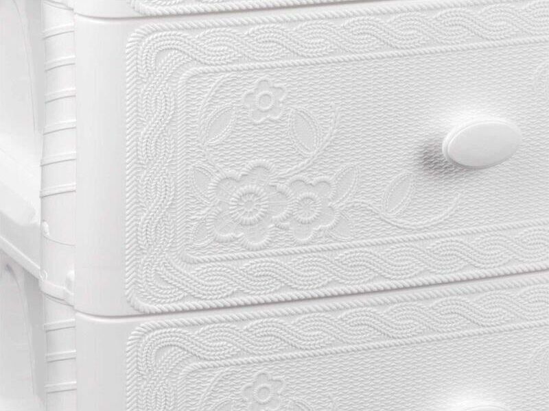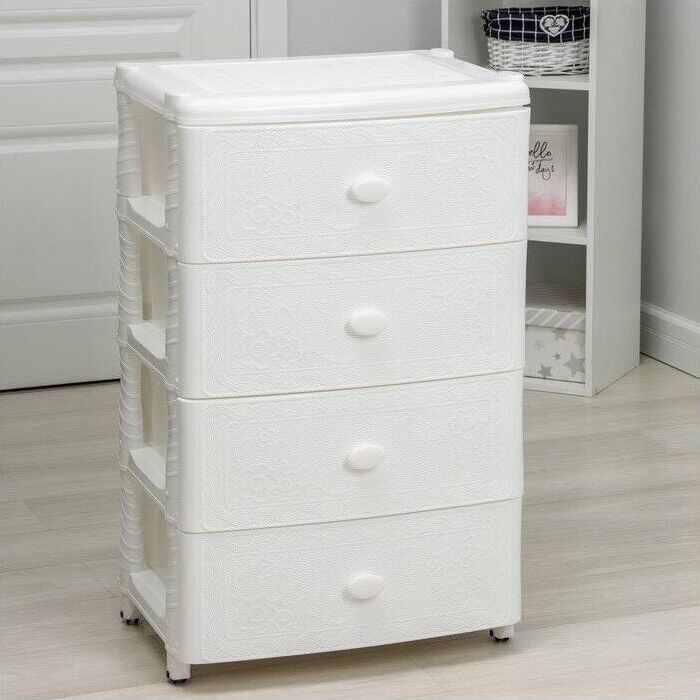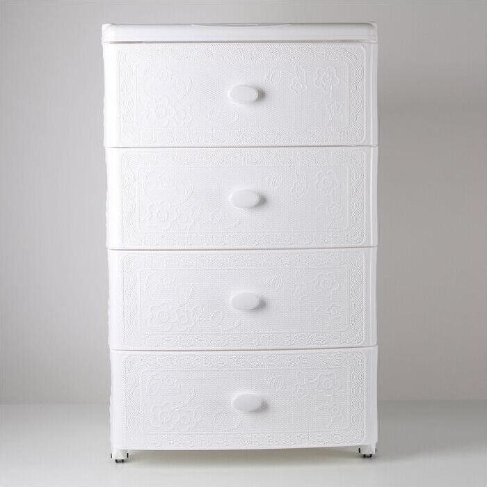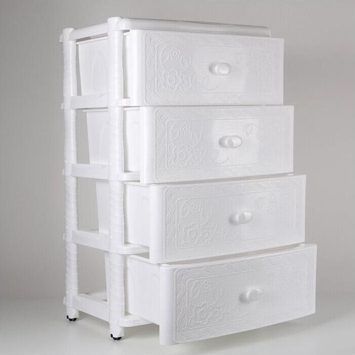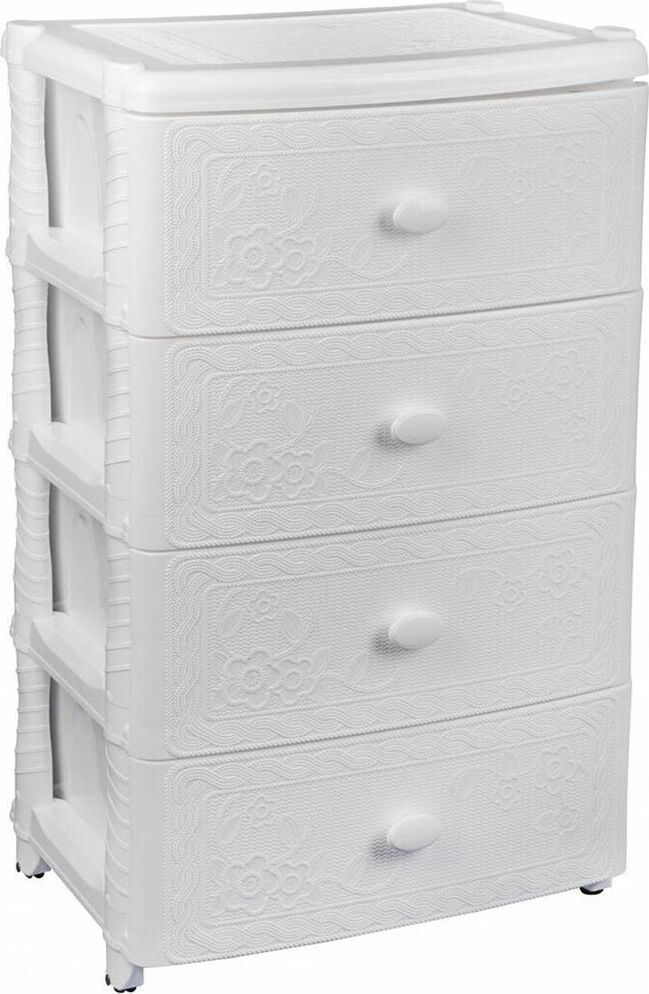 Вес 6.2 кг Размеры изделия (ДхШхВ) 425х560х905 мм Оригинальный и функциональный комод заслужено пользуется большой популярностью среди наших покупателей. Изделие способно гармонично вписаться в интерьер любой комнаты. Комод произведен из высококачественного и безопасного полипропилена. При производстве используется только сертифицированное и экологически чистое, качественное сырье отечественных и зарубежных производителей. Данное изделие произведено на современном технологичном оборудовании, а потому отличается прочностью и устойчивостью разнообразным механическим воздействиям. Также особую прочность изделию придает цельная конструкция перегородок. Оригинальный внешний вид задает плетеная конструкция на поверхности лицевой части ящика. Комод имеет четыре широких выдвижных ящика большой вместимости, в которых будет очень удобно хранить личные вещи и другие принадлежности. Благодаря небольшому весу, комод очень легко передвигается. Комод упаковывается в индивидуальную упаковку, где каждый клиент сможет найти ин
